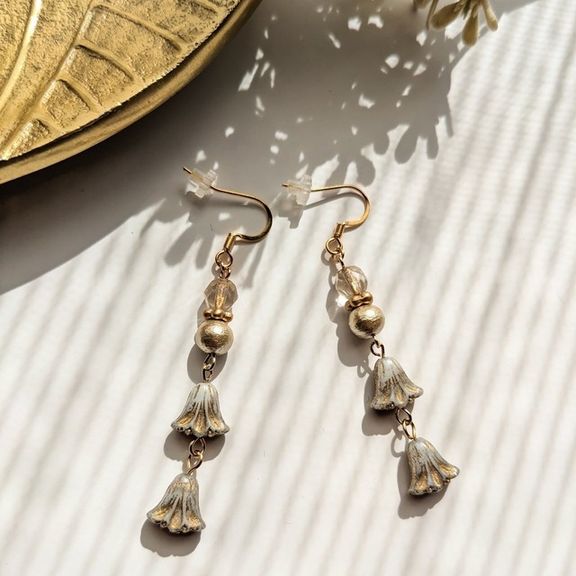 アンティーク風のドレスの様なライトグレーにゴールドをあしらったリリーにベージュのコットンパールとクリスタルゴールドのチェコビーズを合わせた上品で華やかな大人可愛いピアスです。 普段使いはもちろん、入学式やお呼ばれなどにもお使いいただけるアクセサリーです。 □サイズ 全長4.6cm 横巾1cm □素材 チェコビーズ コットンパール他 □金具 金属アレルギー対応 ピアス/フック式サージカルステンレスピアス 落下防止のシリコンキャッチ付 ※イヤリングやスタッドピアスにも無料で変更承っています。 金具変更オプションからお選び下さい。 □金属アレルギー対応について 当店は金属アレルギー対応をしておりますが、全ての金具が対応しているわけではございません。 上記の金具と一部の部品のみアレルギー対応になります。万が一、アレルギー反応が出ましたら速やかに使用を中止してください。責任は負いかねます。 全ての金具をアレルギー対応へ変更のご希望がございましたらお求めの前にご相談下さい。個別対応させていただきます。 □使用上の注意 こちらはデリケートな商品です。汗や水濡れは金具や使用素材の変色、塗装加工の色剥げなどの原因になりますのでお取り扱いにご注意下さい。