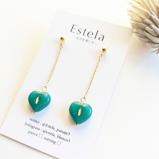 丸みのある可愛いクリーミーグリーンのキャンディハートをキラッと光るボールチェーンで繋いで揺れを楽しむピアスです。 タートルニットに合わせてゆらゆら揺らして可愛さUPです!! □金具 金属アレルギー対応 ○スタッド式ピアス/サージカルステンレス ※イヤリングやフック式ピアス、スタッドピアスにも無料で変更承っています。(全て金属アレルギー対応) 金具変更オプションからお選び下さい。 □金属アレルギー対応について 当店は金属アレルギー対応をしておりますが、全ての金具が対応しているわけではございません。 肌に触れる上記の金具と一部の部品のみアレルギー対応になります。万が一、アレルギー反応が出ましたら速やかに使用を中止してください。責任は負いかねます。 全ての金具をアレルギー対応へ変更のご希望がございましたらお求めの前にご相談下さい。個別対応させていただきます。 □使用上の注意 こちらはデリケートな商品です。汗や水濡れは金具や使用素材の変色、塗装加工の色剥げなどの原因になりますのでお取り扱いにご注意下さい。