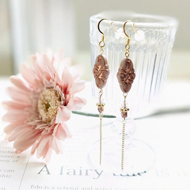 お洒落なアラベスク模様のローズラスターとブロンズ使いが甘すぎない大人の可愛いさを演出。そこにエレガントなチェーンを合わせることで更に上品に。 プレゼントにもオススメです! □サイズ 全長7cm 横巾1cm □金具 金属アレルギー対応 ◯ピアス/フック式サージカルステンレスピアス 落下防止のシリコンキャッチ付 ◯イヤリング/ニッケルフリーネジバネ式イヤリング 耳が痛くなりにくいシリコンカバー付 ※イヤリングやスタッドピアスにも無料で変更承っています。 金具変更オプションからお選び下さい。 ◯金属アレルギー対応について 当店は金属アレルギー対応をしておりますが、全ての金具が対応しているわけではございません。 上記の金具と一部の部品のみアレルギー対応になります。万が一、アレルギー反応が出ましたら速やかに使用を中止してください。責任は負いかねます。 全ての金具をアレルギー対応へ変更のご希望がございましたらお求めの前にご相談下さい。個別対応させていただきます。 ◯使用上の注意 こちらはデリケートな商品です。汗や水濡れは金具や使用素材の変色、塗装加工の色剥げなどの原因になりますのでお取り扱いにご注意下さい。