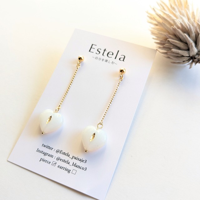 【Sale】ミルキーホワイトのキャンディハートとボールチェーン ピアス