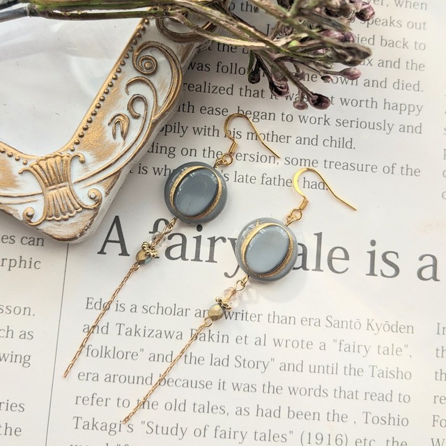 【Sale】グレーのコインフラワーのチェコビーズとロングチェーンピアス