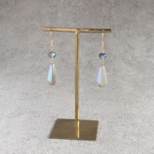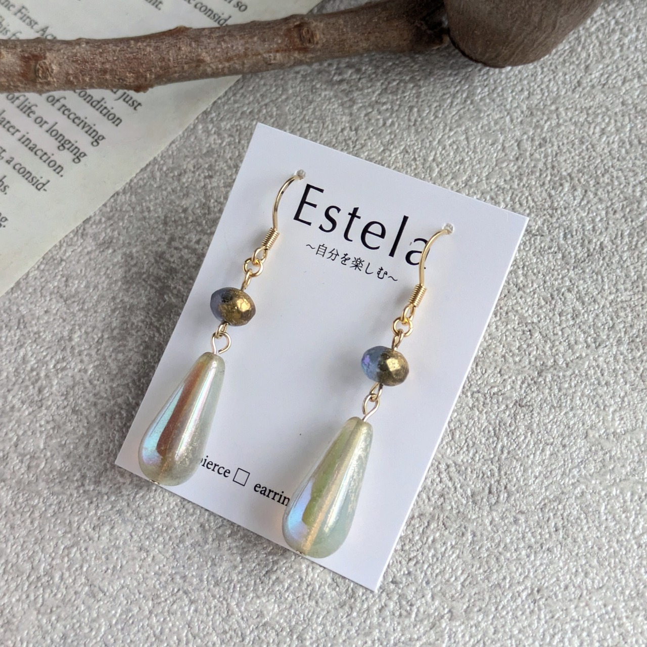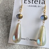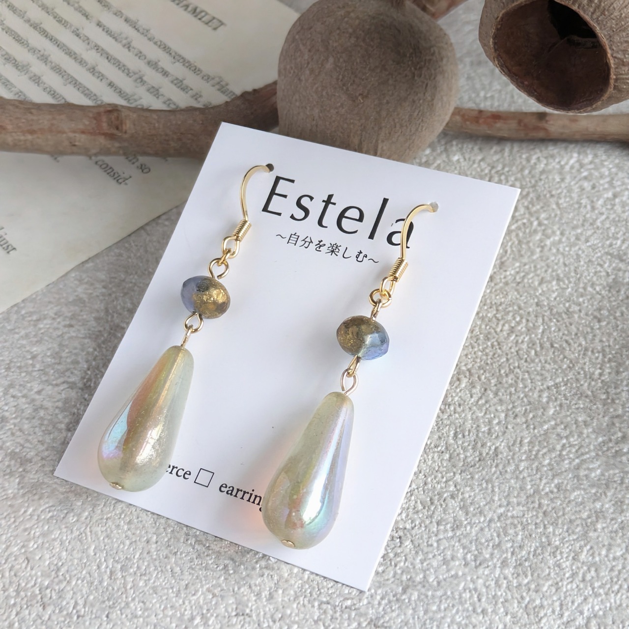 角度によってオーロラのように変化するしずく型のチェコガラスと、エッヂドブルーのファイアポリッシュビーズを組み合わせた幻想的なピアスです。