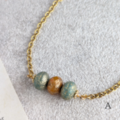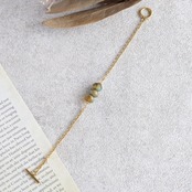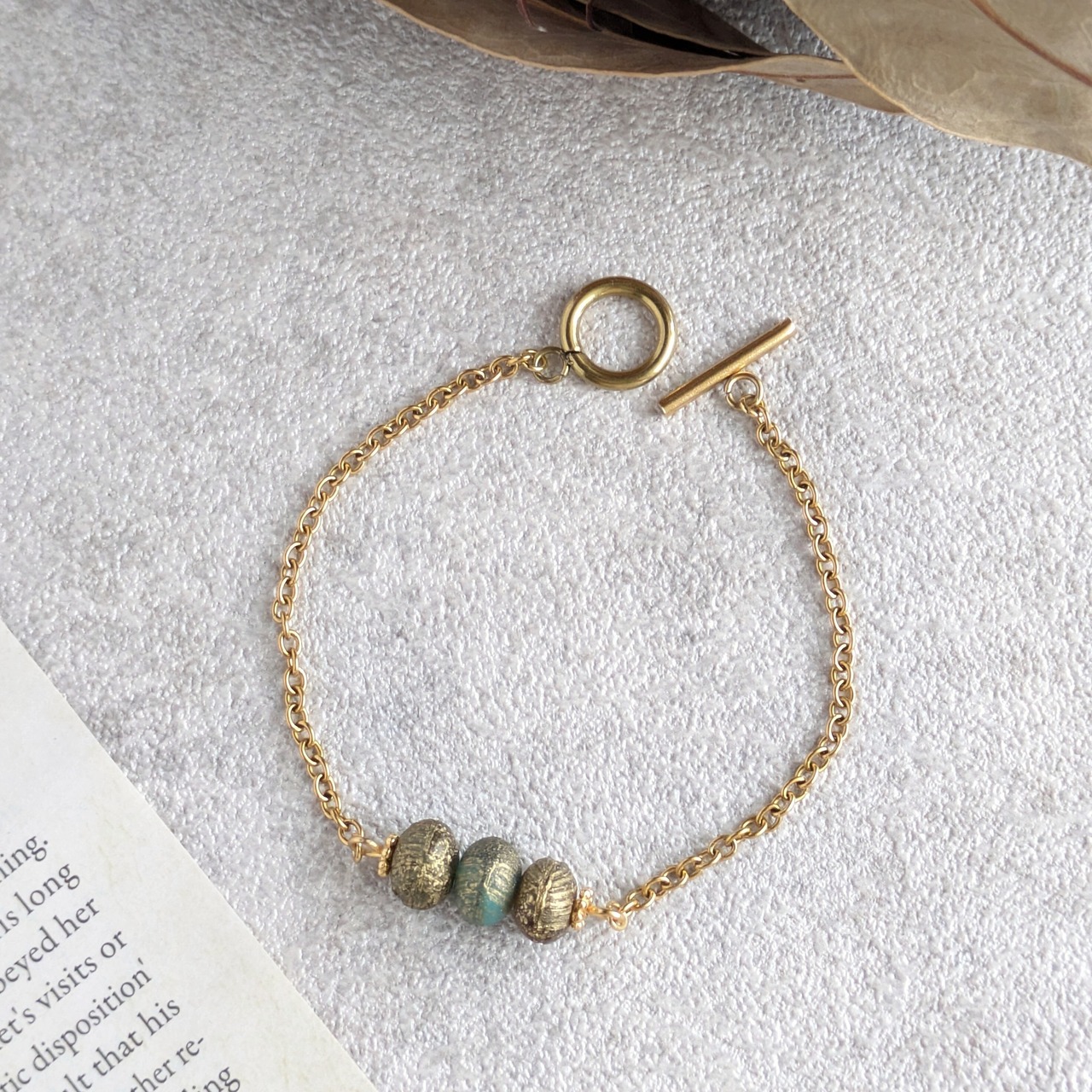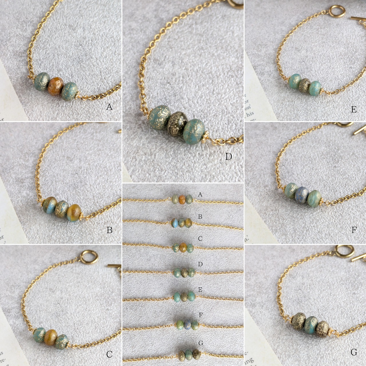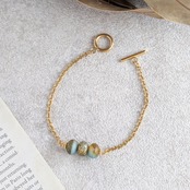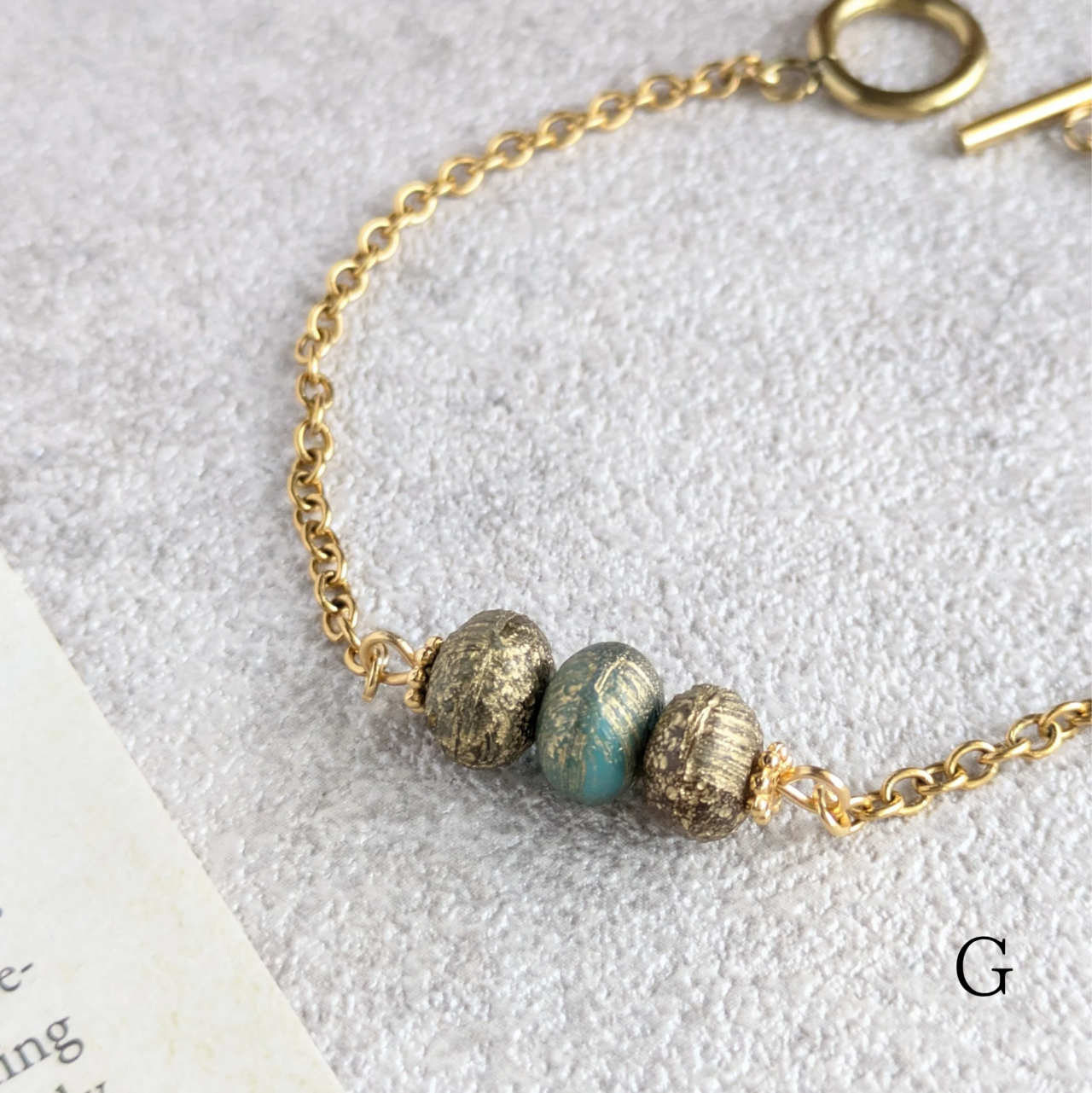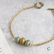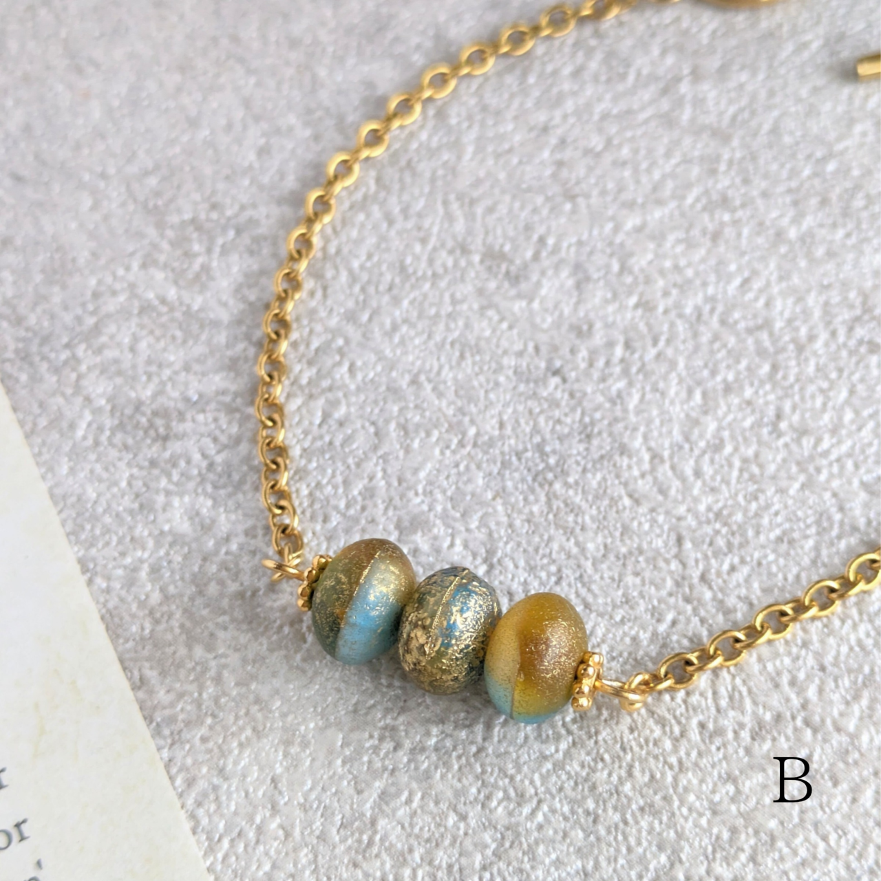 ひとつひとつ微妙に異なる輝きを放つチェコビーズを、肌なじみの良いゴールドチェーンと組み合わせた、上品でナチュラルな雰囲気漂うブレスレットです。