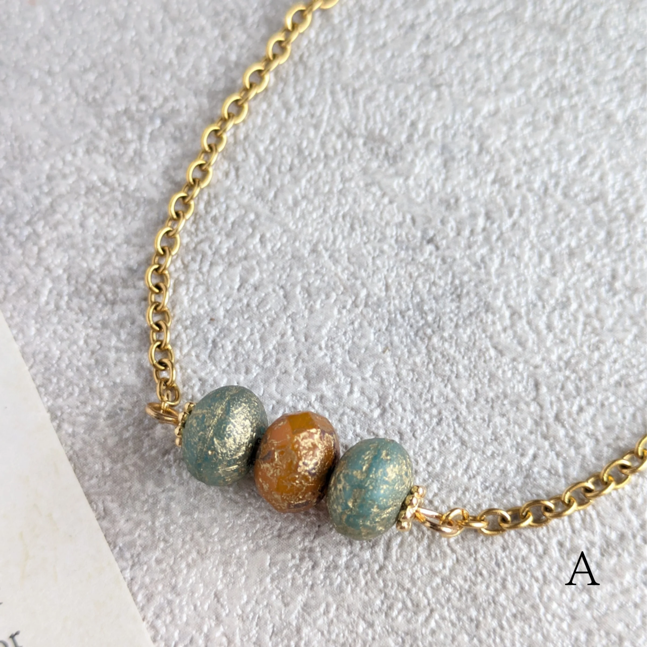 中央に配した3粒のチェコビーズは、深みのあるグリーン・アンバー・ブルー系の絶妙なニュアンスカラー。光の加減で表情を変えるマット×ツヤのミックスが、シンプルながら印象的な存在感を放ちます。