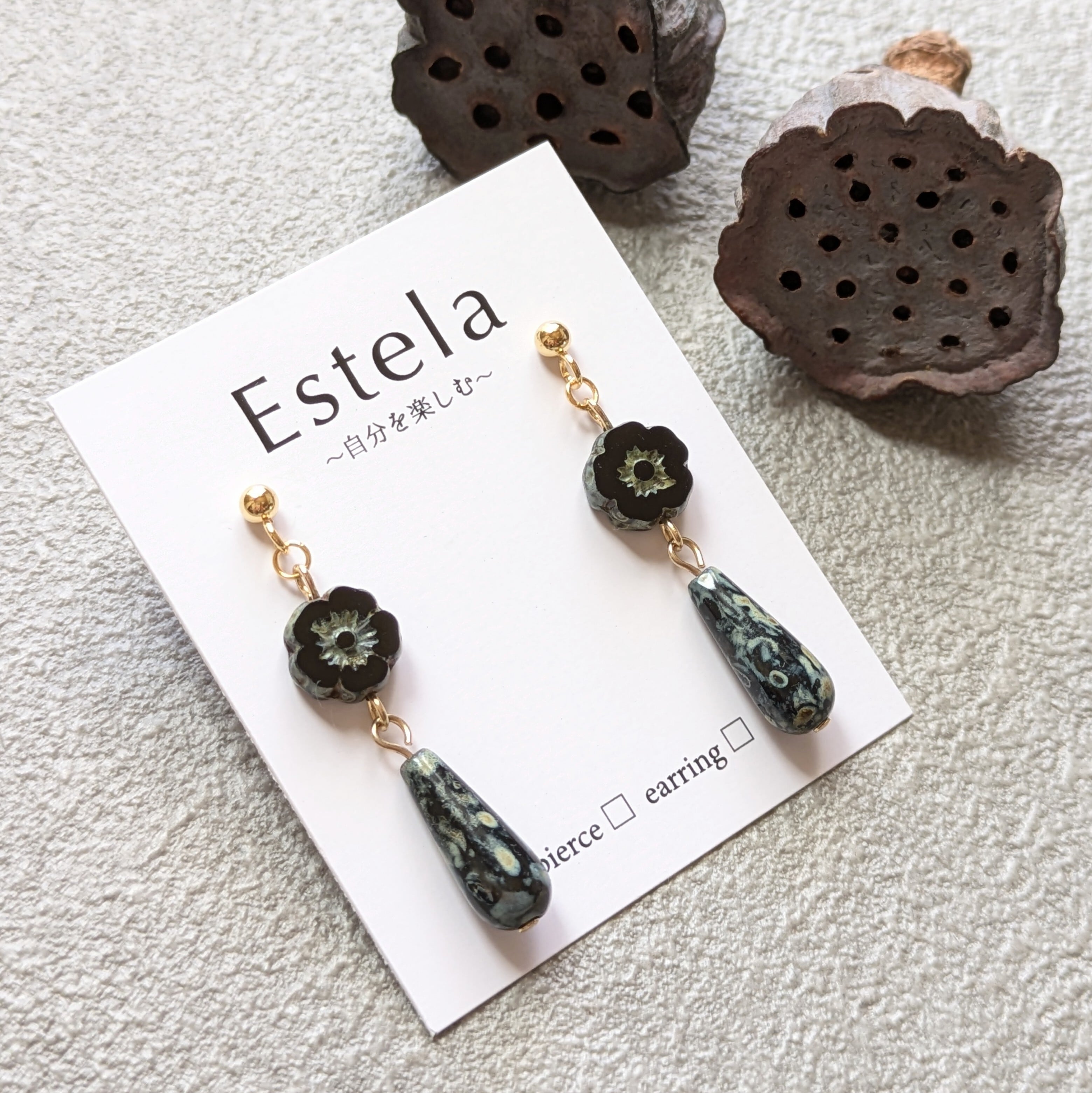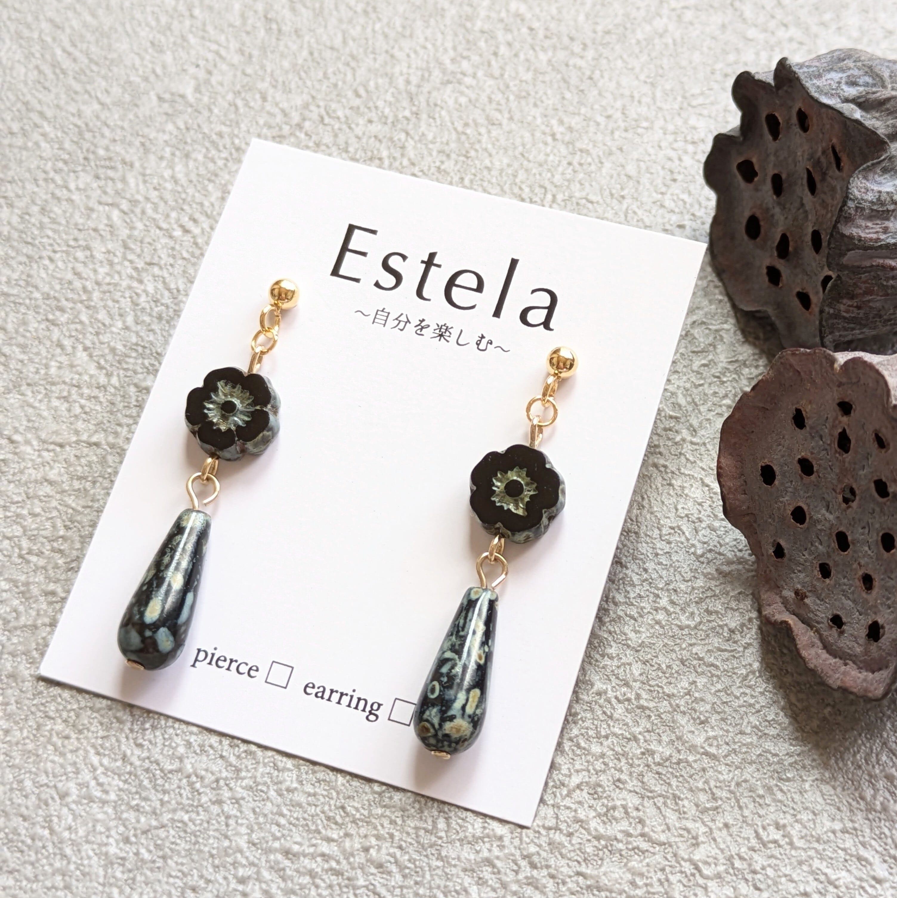 このピアス/イヤリングは、上品なピカソ加工をしたブラックのフラワーモチーフに、神秘的なマーブル模様のドロップチャームを組み合わせたデザインです。見る角度によって表情を変えるマーブル模様は、まるで夜空にきらめく星々や、深い森に潜む小川のよう。落ち着いた色合いの中に、確かな個性が光ります。