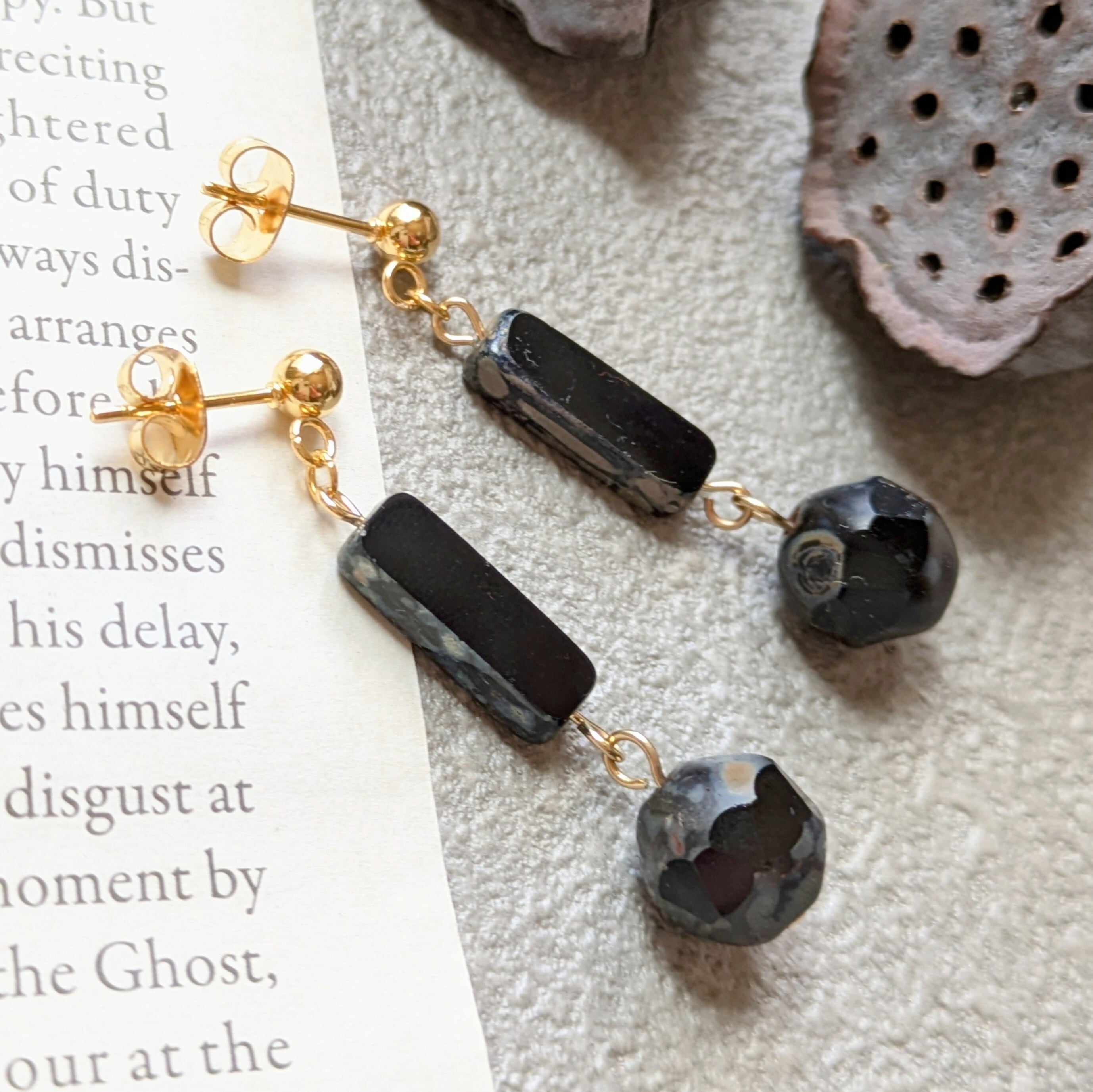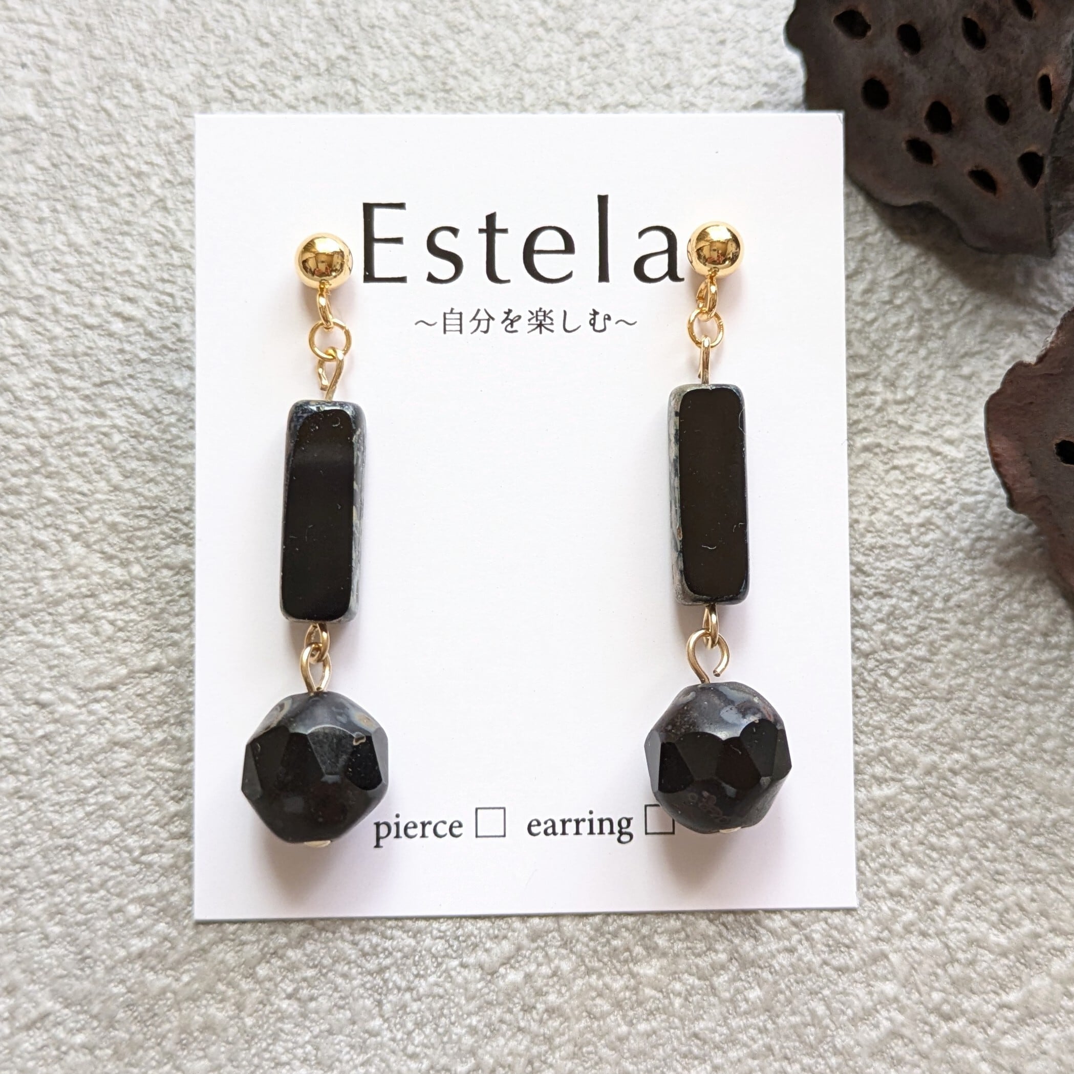 夜の静寂に包まれたような、深く神秘的なブラック。このピアス/イヤリングは、マットな質感のブラック長方形ビーズと、ピカソ加工が施された多面カットのマーブルビーズを組み合わせた、個性あふれるデザインです。