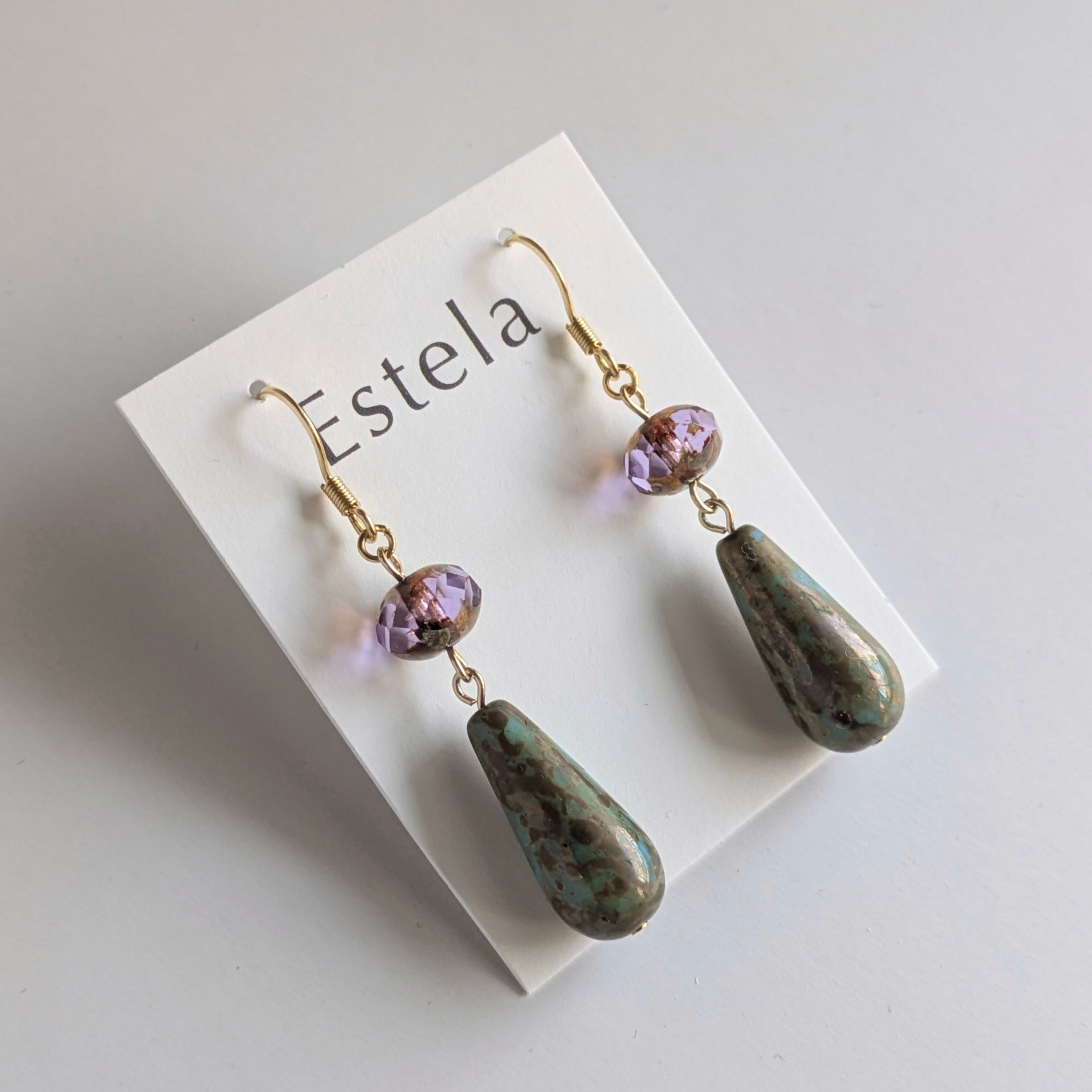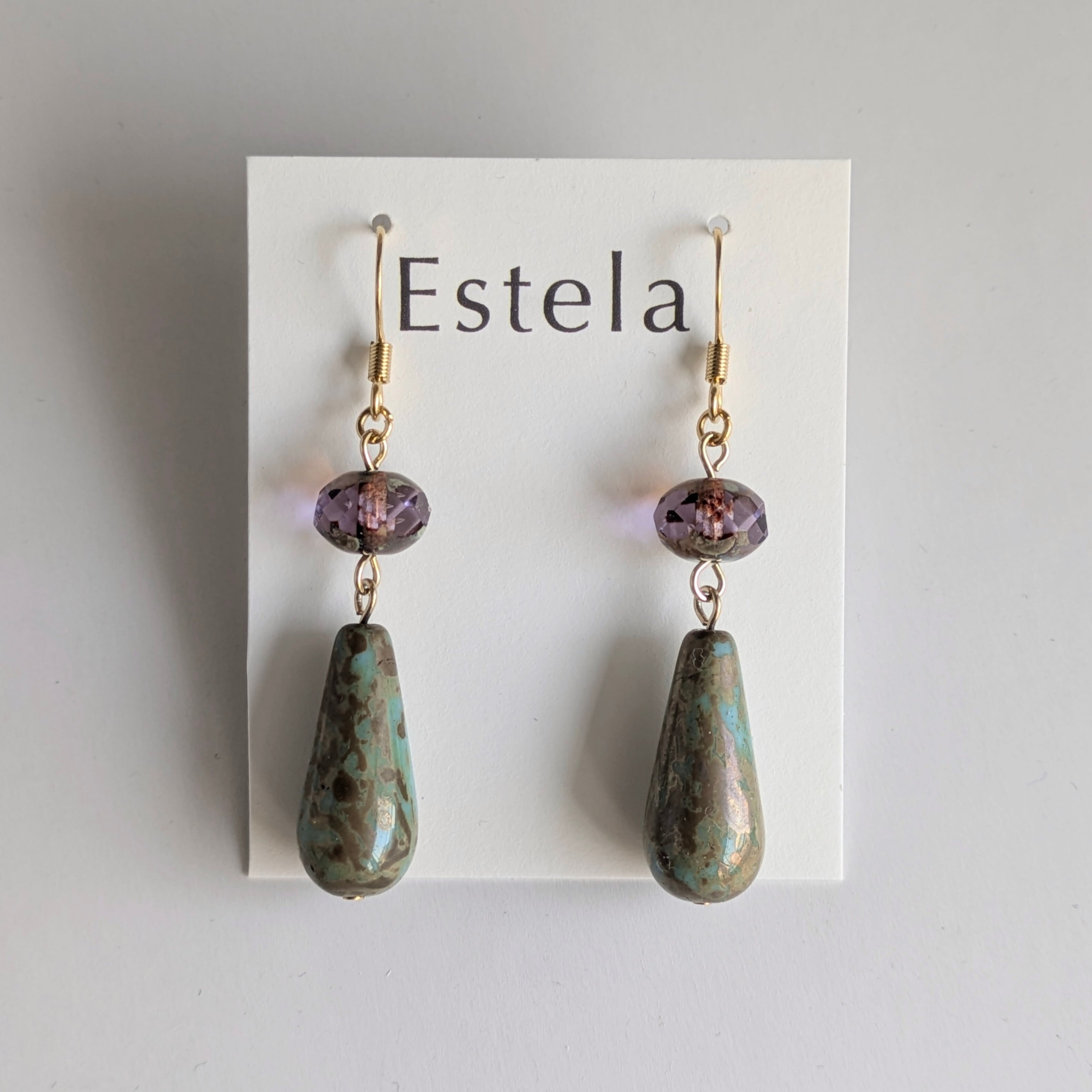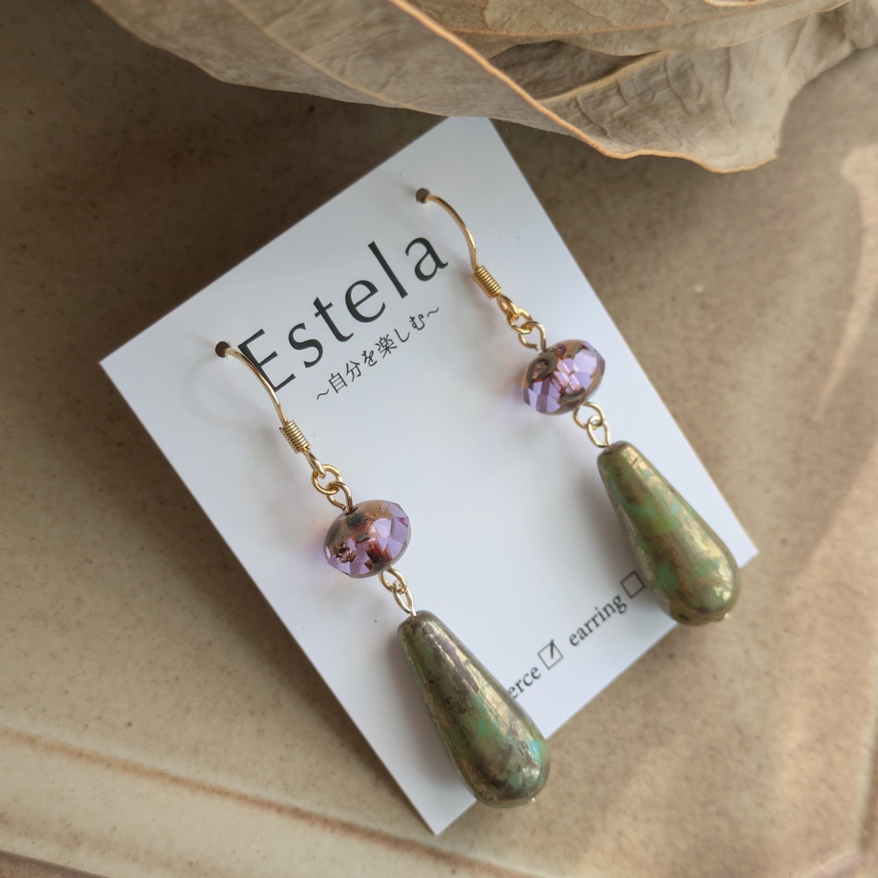深い緑とゴールドが複雑に混ざり合う、玉虫色のドロップビーズが主役のピアスです。角度によってカーキやブラウン、ゴールドへと表情を変える独特な色合いが、ノスタルジックで洗練された雰囲気を醸し出します。上部には、アメジストカラーにマーブル模様を帯びたビーズを配置し、夕焼け空のような儚い美しさを表現しました。