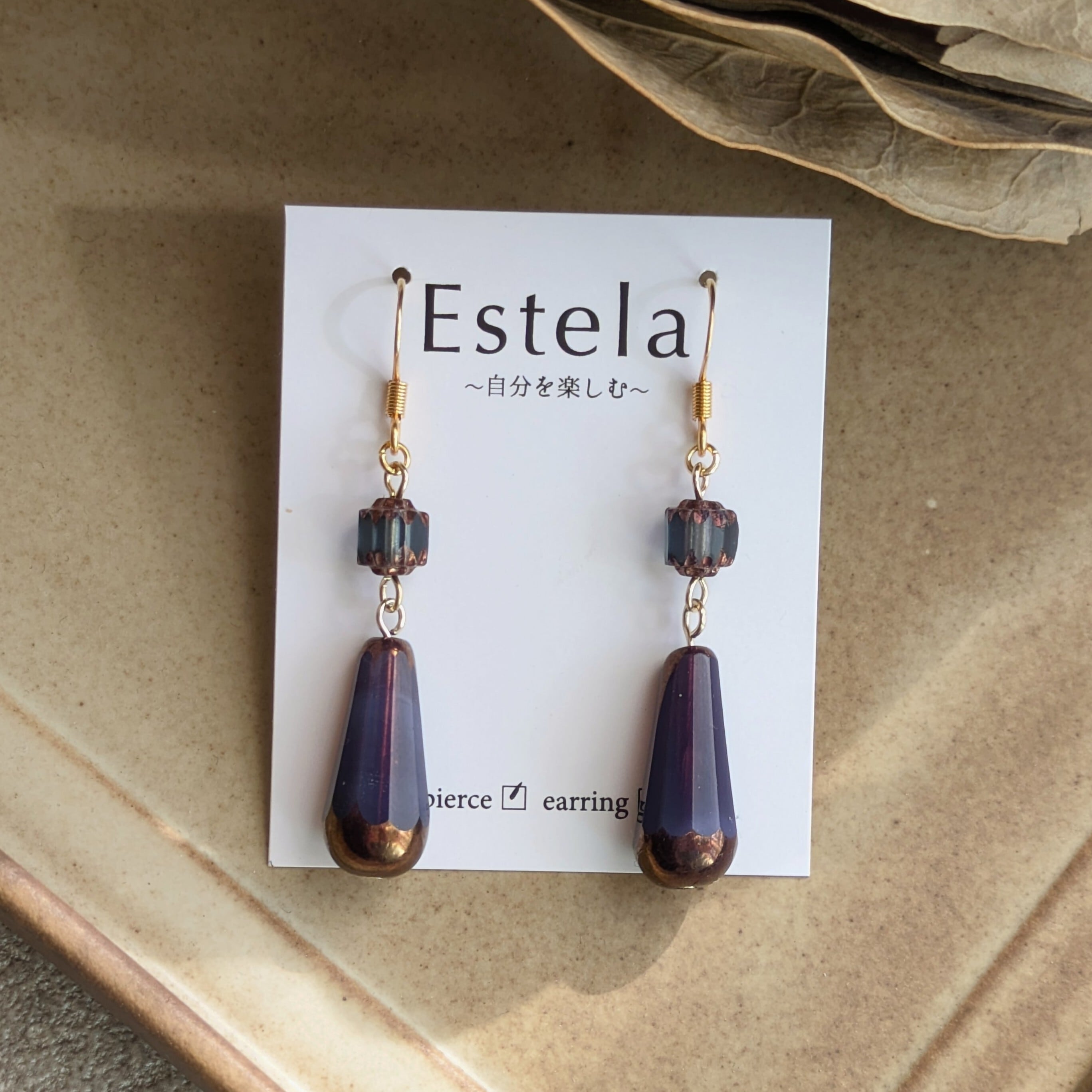 深く濃い葡萄色(パープル)のドロップ型ビーズが印象的なロングピアスです。雫の底にはブロンズのような色が差し、光の加減でわずかに煌めき、ミステリアスな雰囲気を醸し出します。上部には、スモーキーなバイオレットのキューブ型ビーズを配置し、全体のデザインにモダンで洗練された印象をプラス。