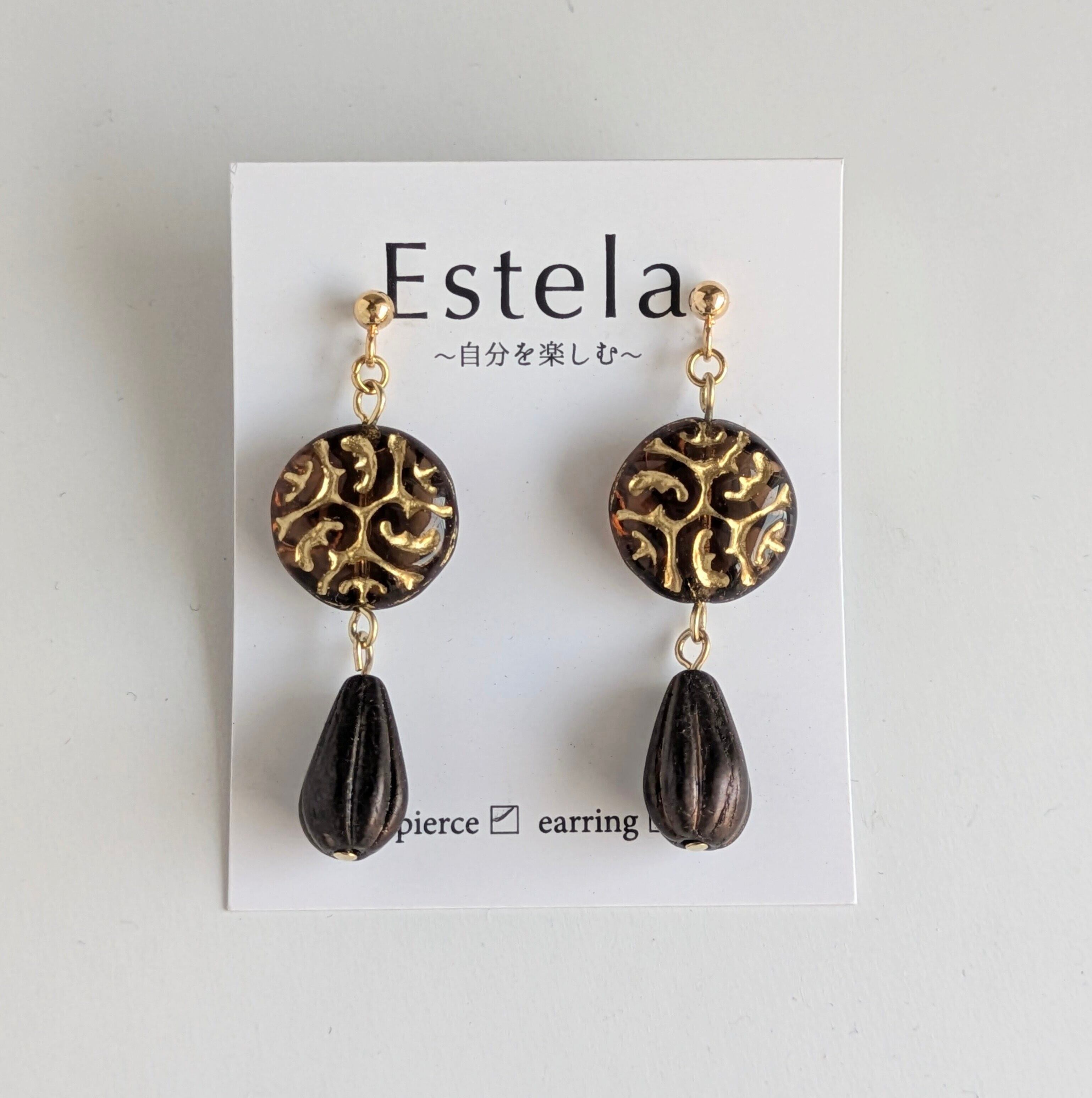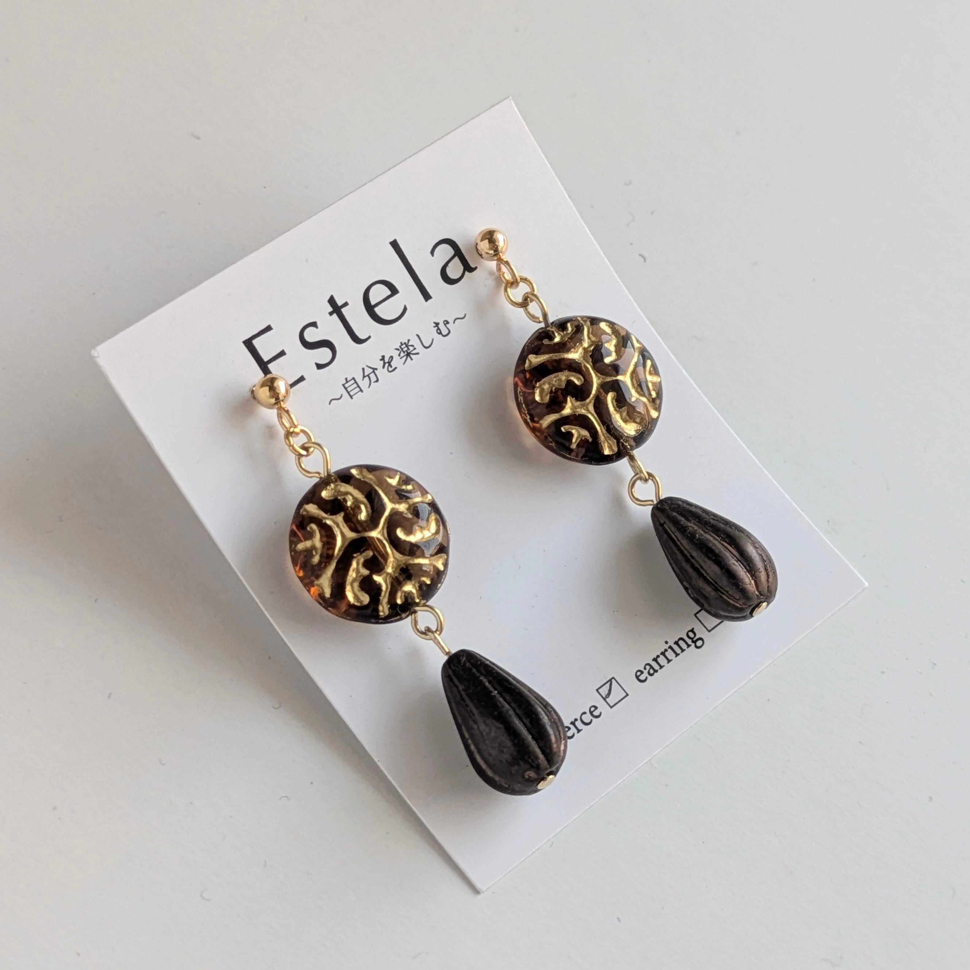 温かみのある琥珀色のピアスです。コインモチーフには、アンティークゴールドの繊細なアラベスクが施され、まるで時が止まった宝物のように、ノスタルジックな雰囲気を醸し出します。その下には、深い茶色に艶やかな蜜色ドロップビーズを揺らしました。