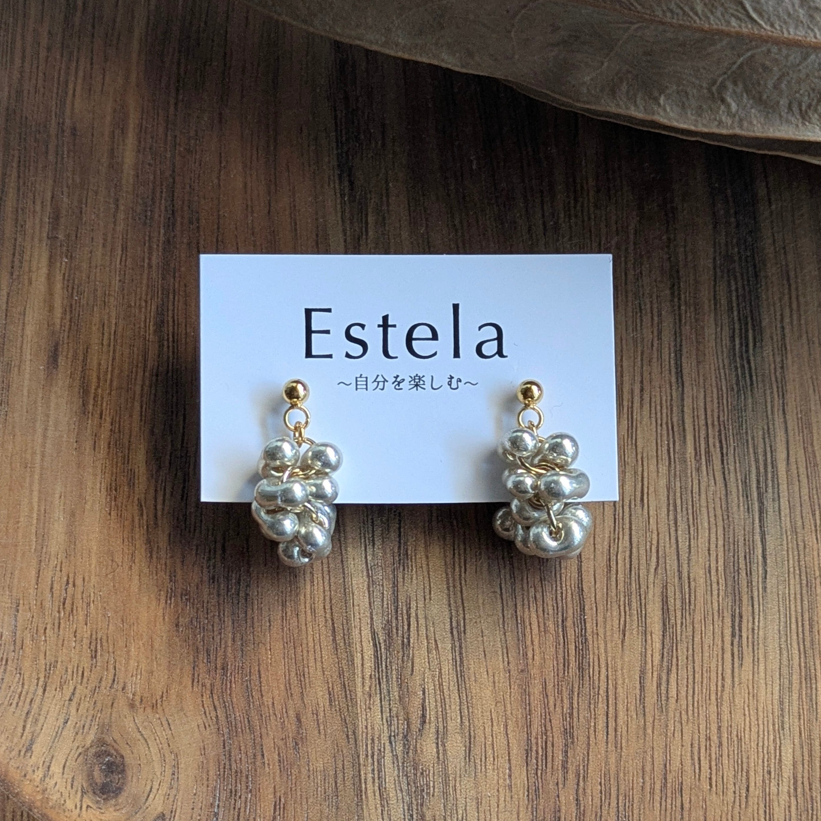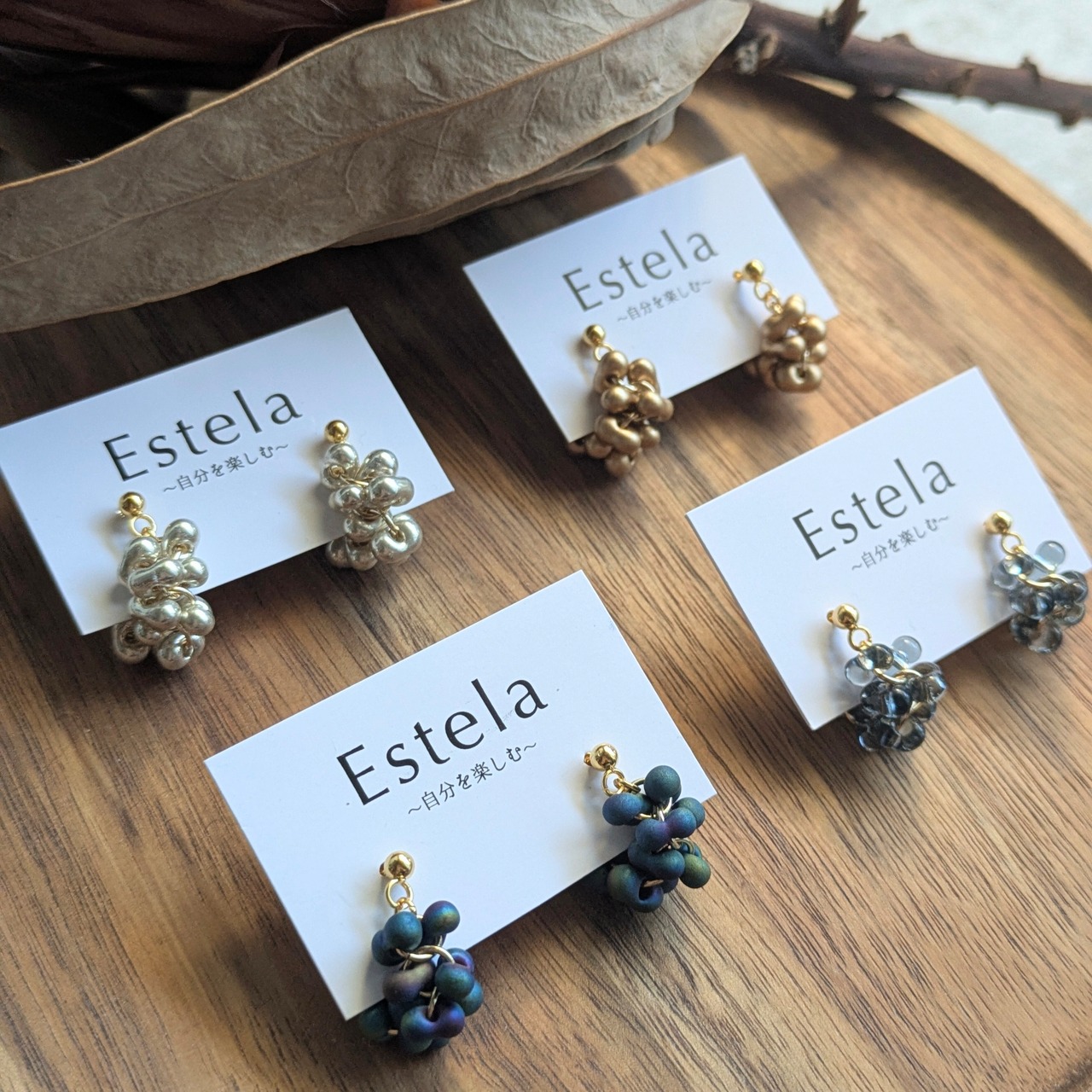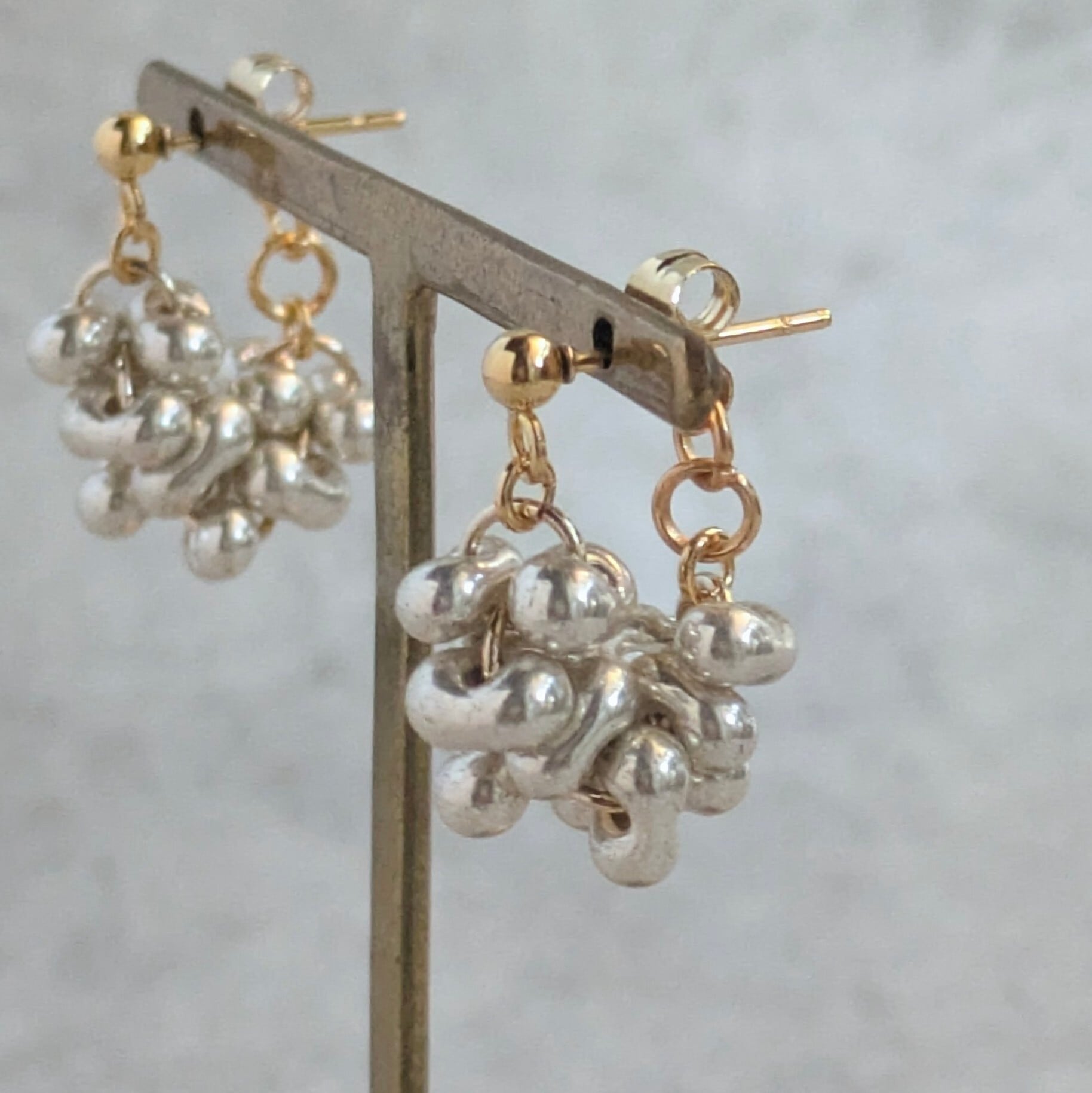 チェコビーズのぷっくりとした丸みのあるファルファーレで立体的な房状のモチーフを作り上げたシリーズです。まるで夜空に瞬く星の集まりや、木々に実る小さな宝石の房のように、繊細で奥深い輝きを耳元に添えます。