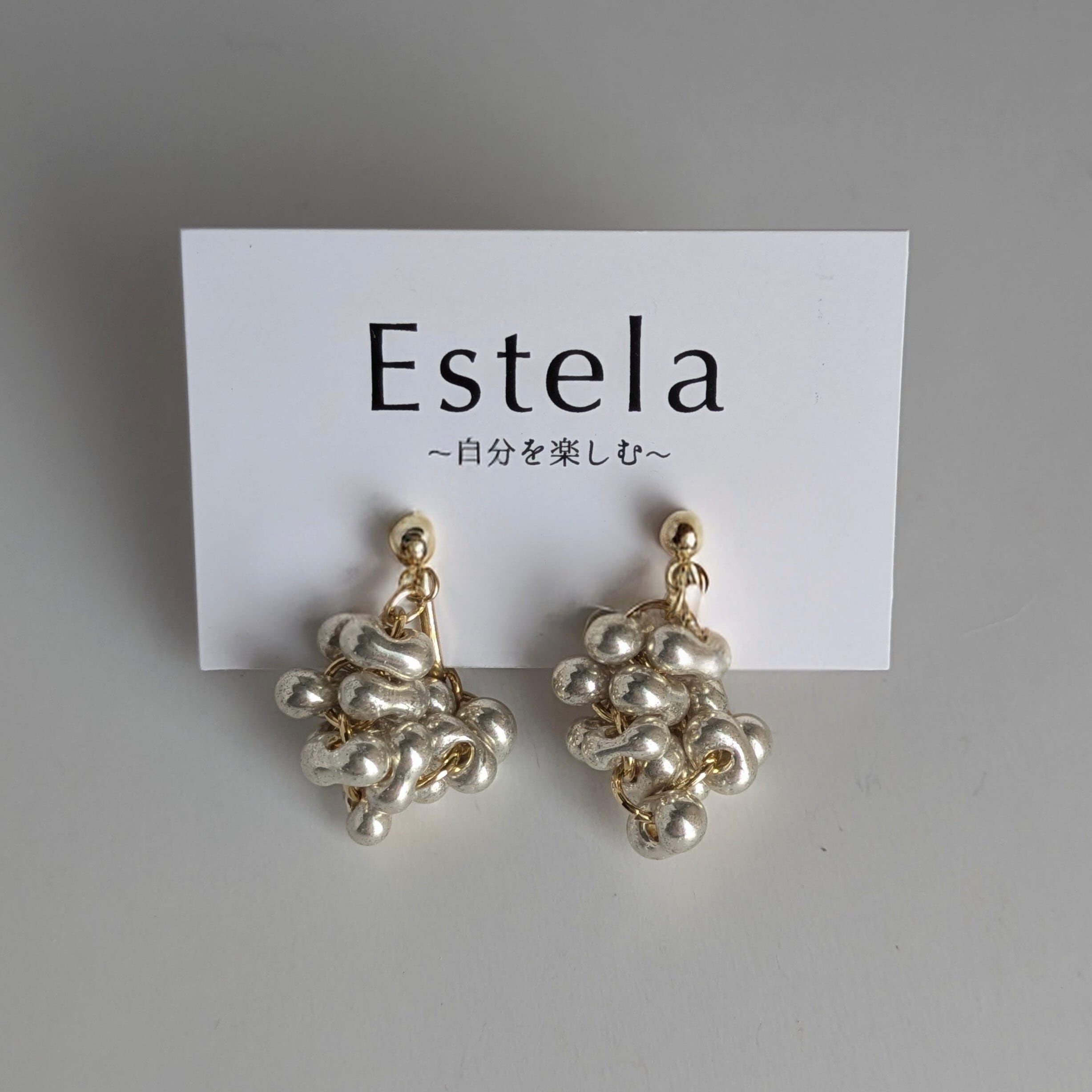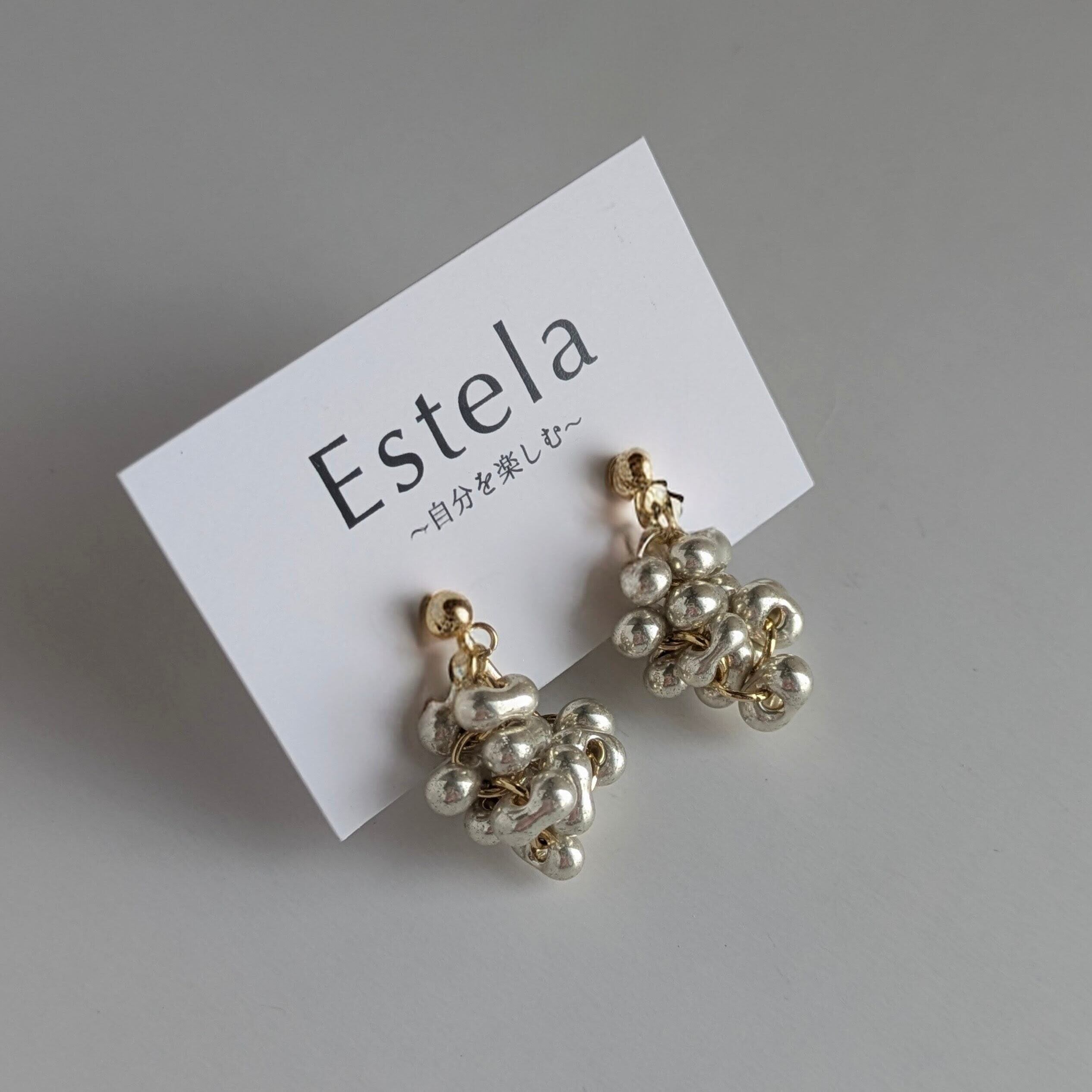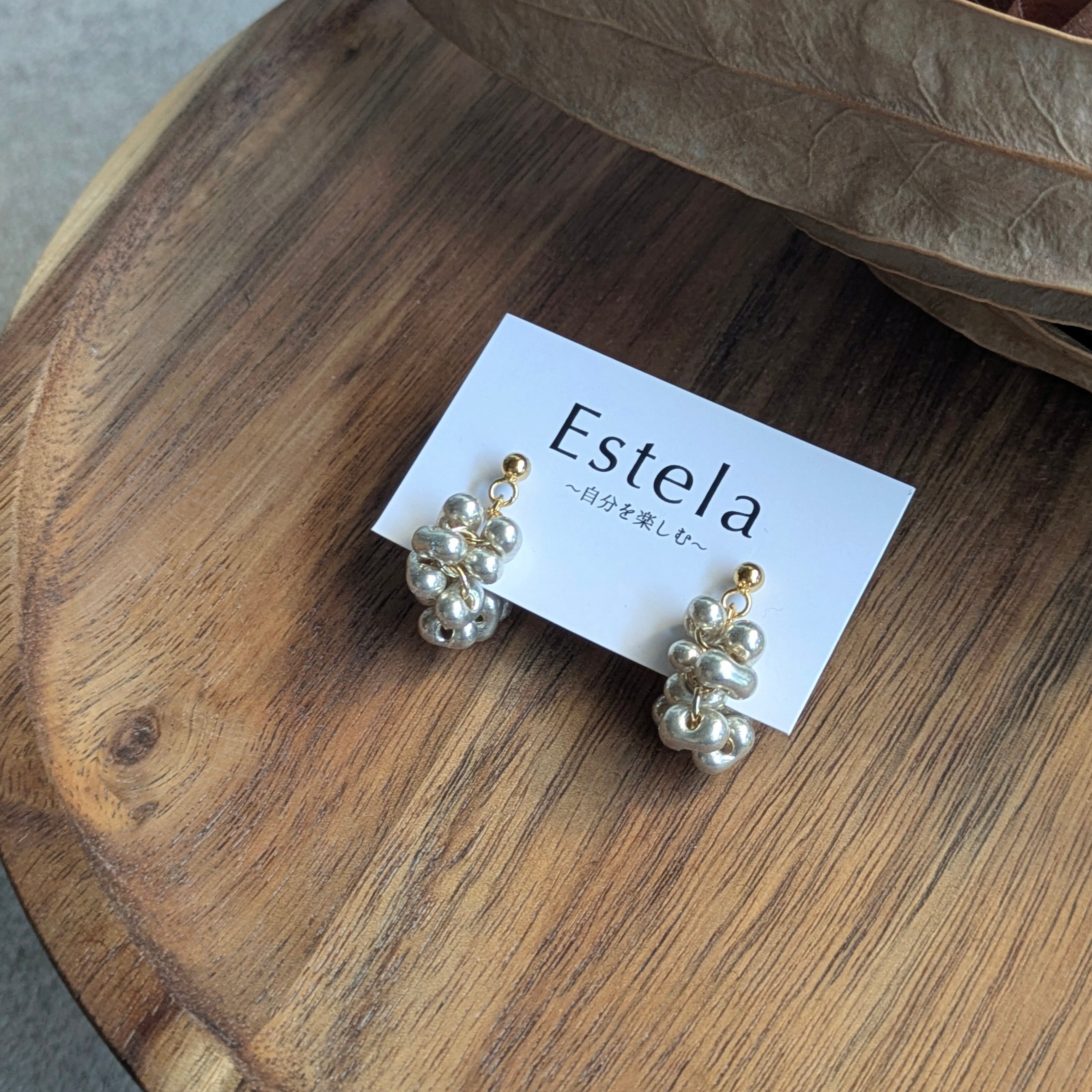 チェコビーズのぷっくりとした丸みのあるファルファーレで立体的な房状のモチーフを作り上げたシリーズです。まるで夜空に瞬く星の集まりや、木々に実る小さな宝石の房のように、繊細で奥深い輝きを耳元に添えます。