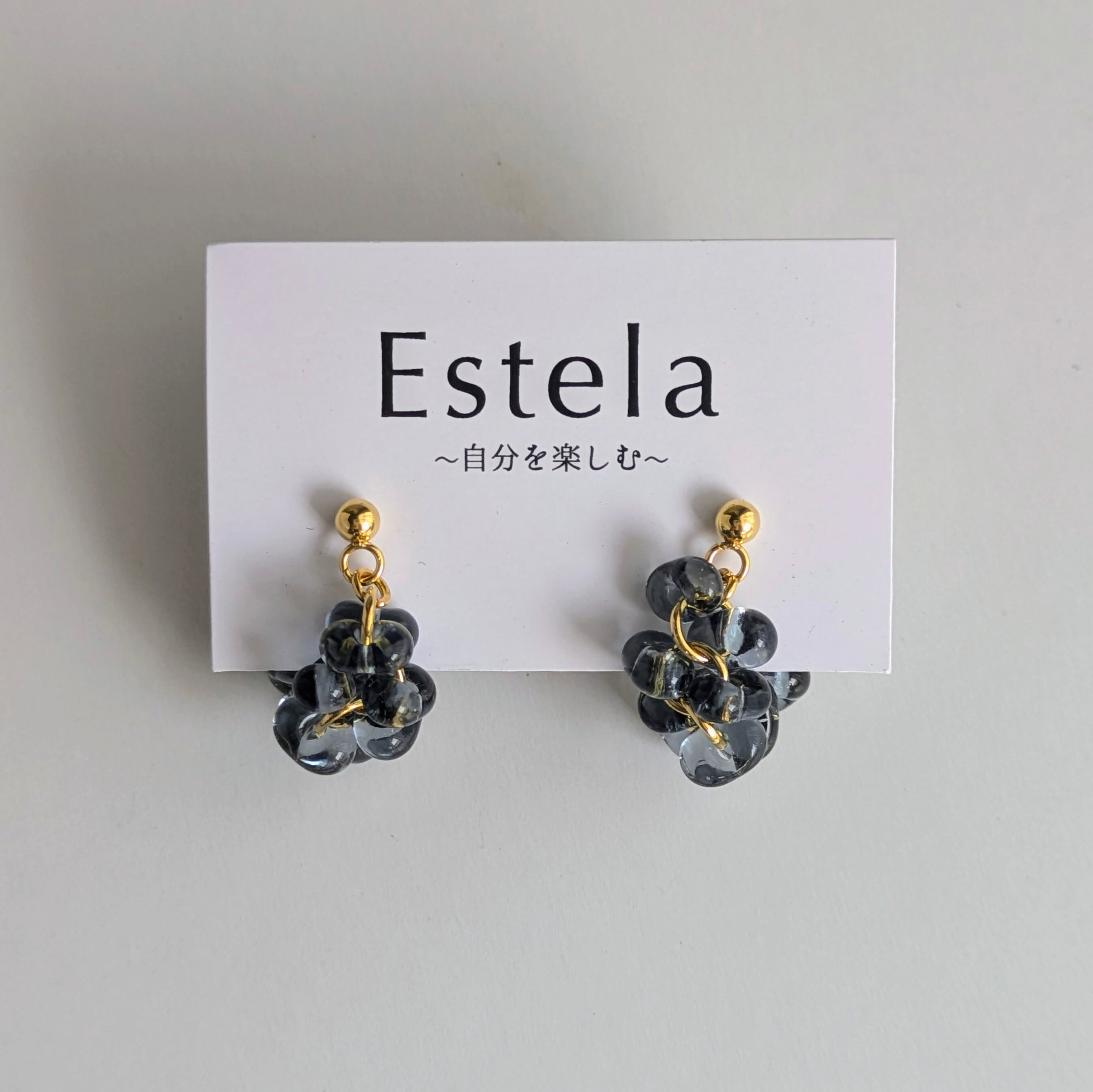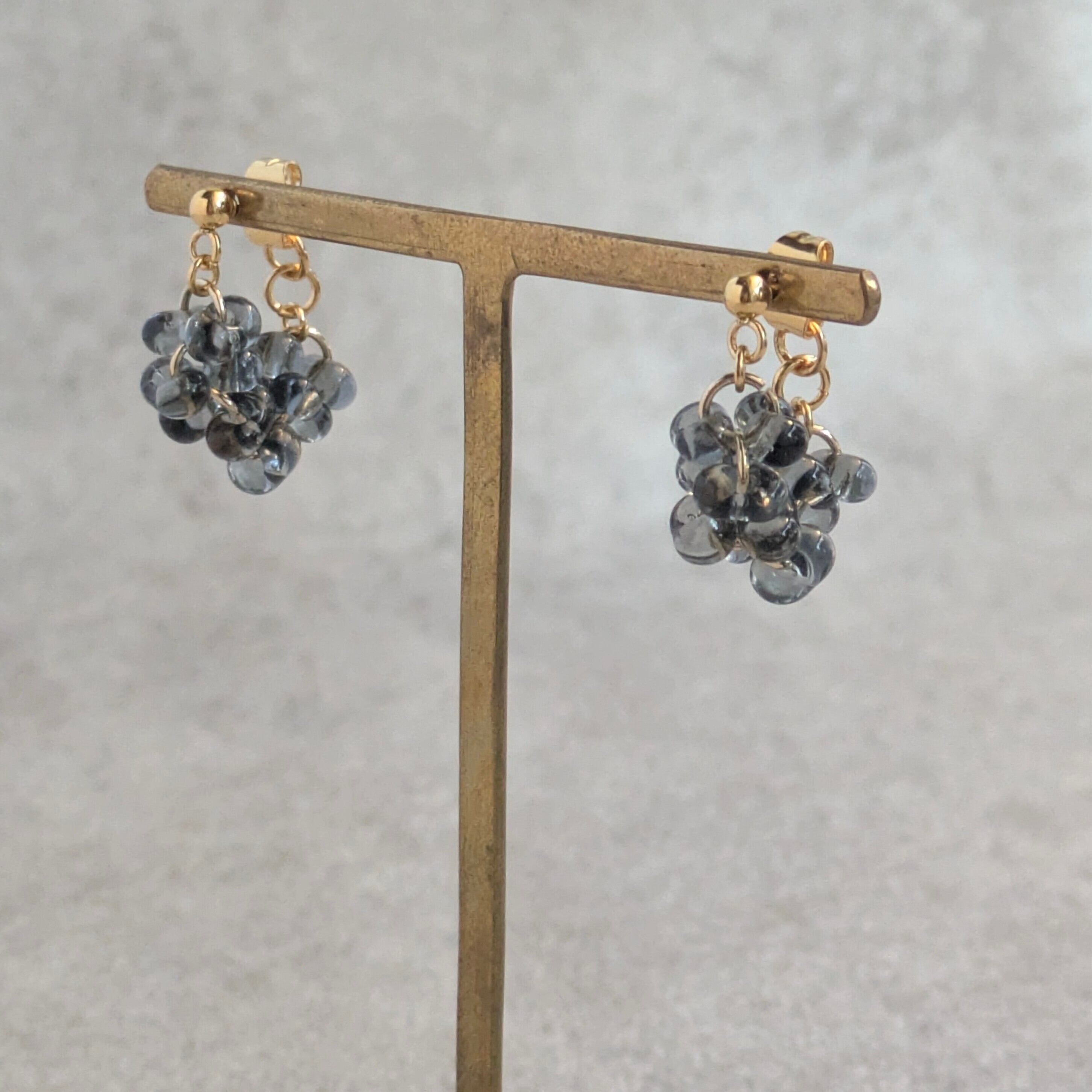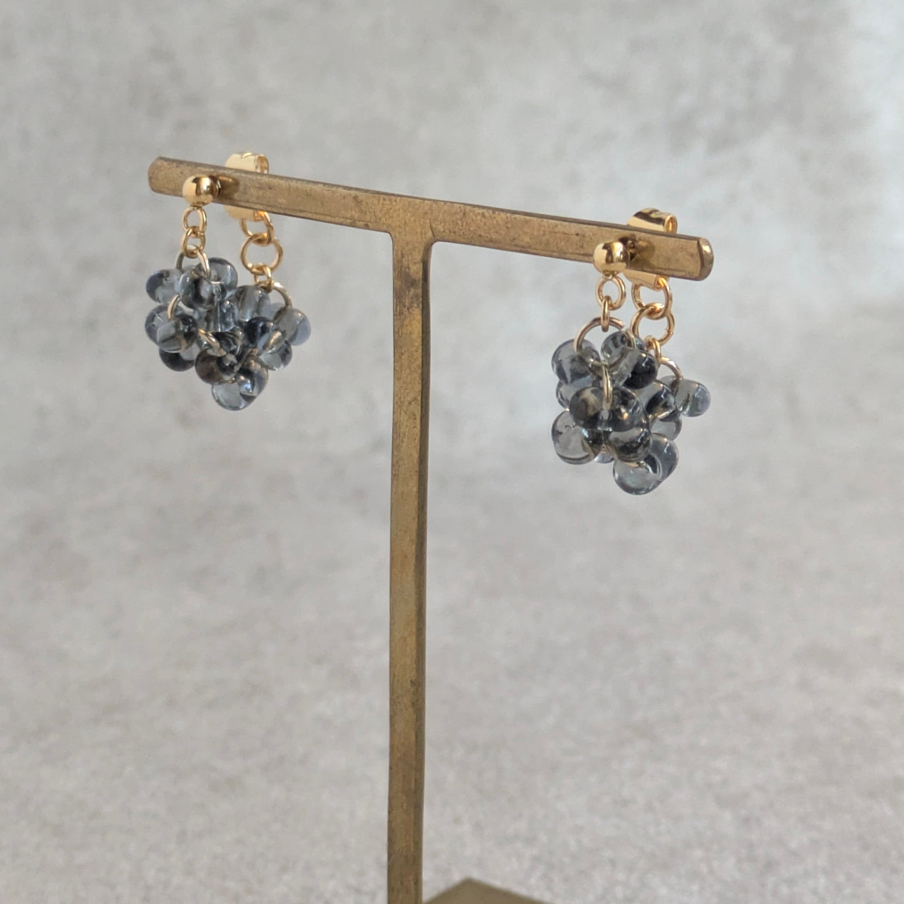 チェコビーズのぷっくりとした丸みのあるファルファーレで立体的な房状のモチーフを作り上げたシリーズです。まるで夜空に瞬く星の集まりや、木々に実る小さな宝石の房のように、繊細で奥深い輝きを耳元に添えます。
