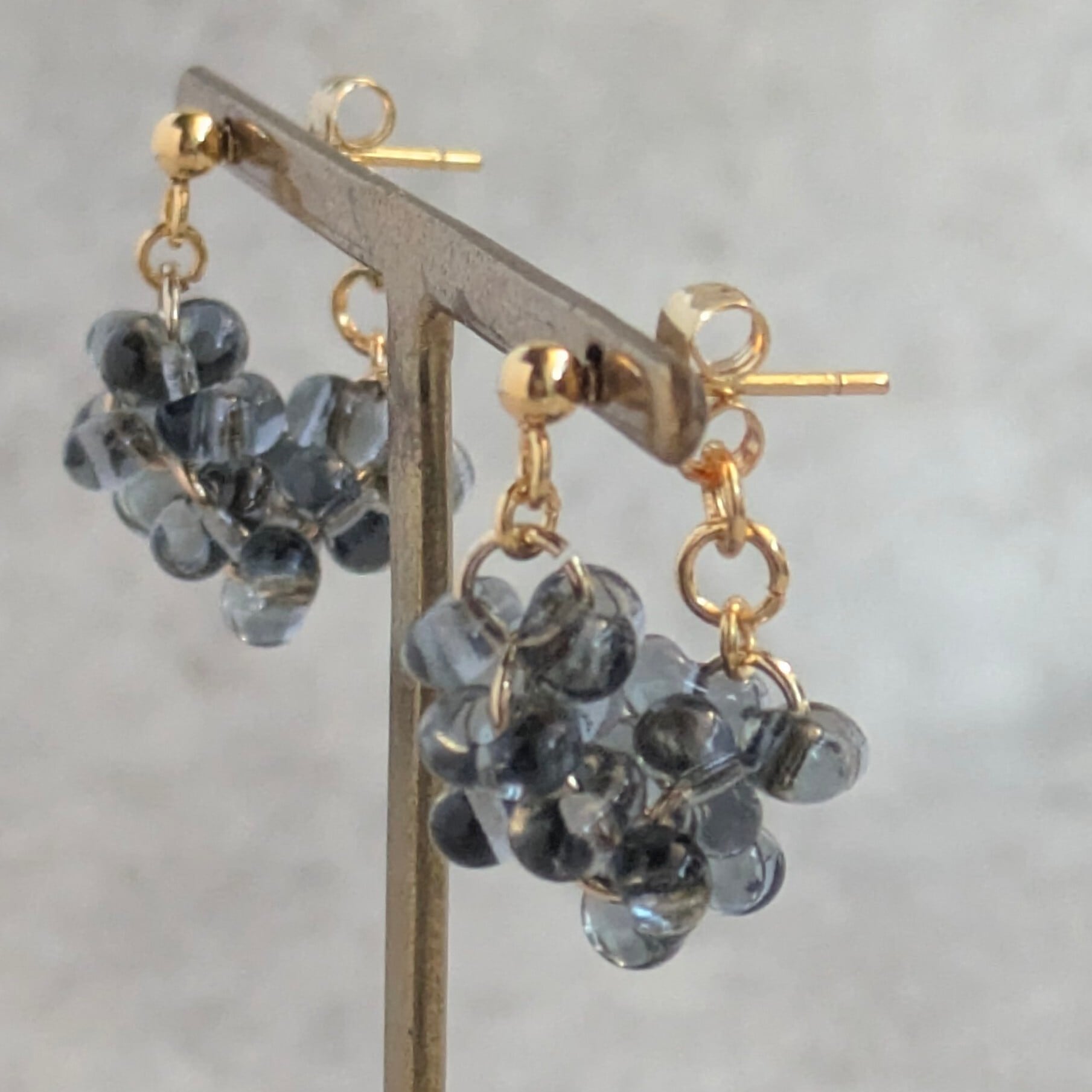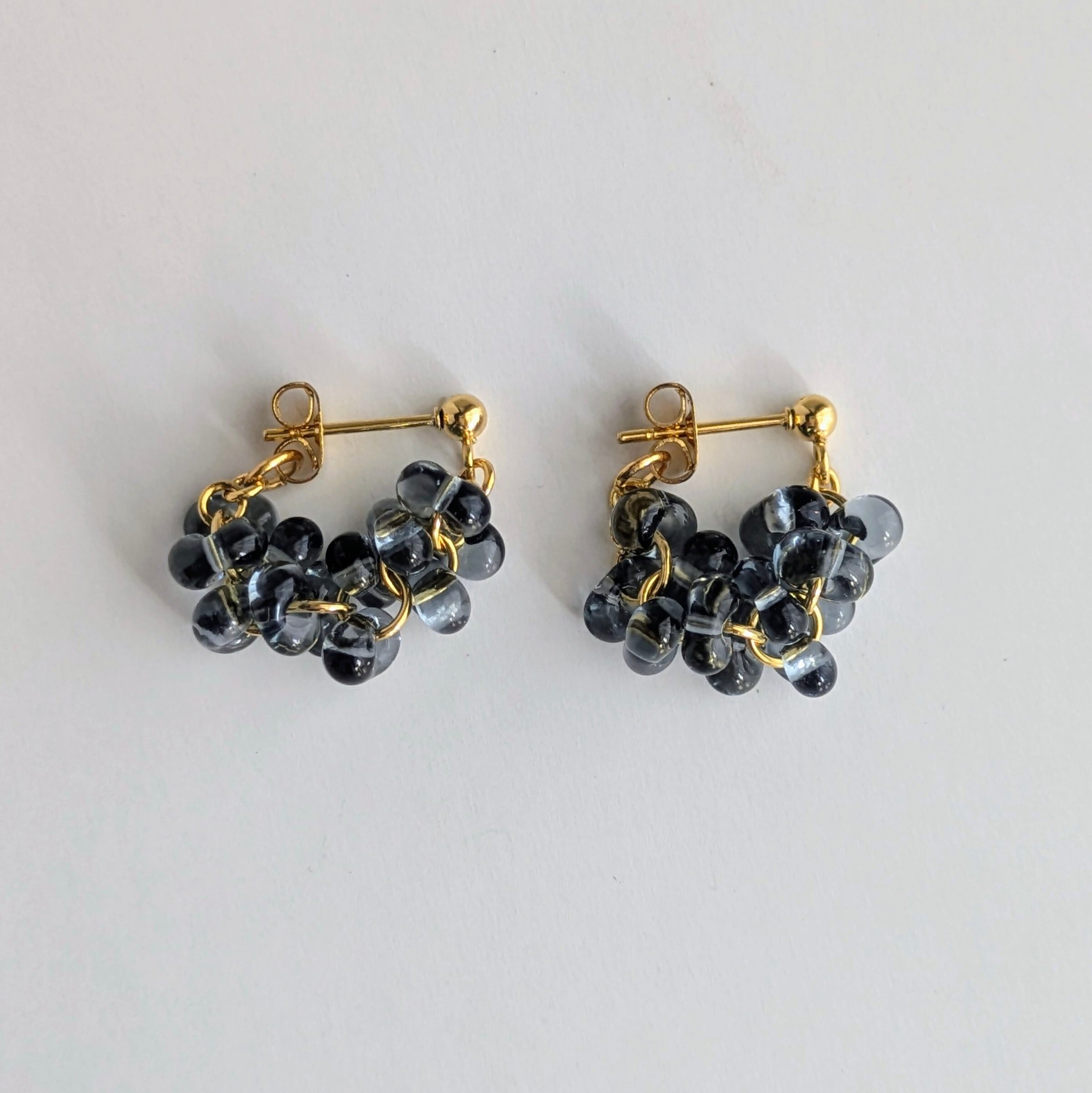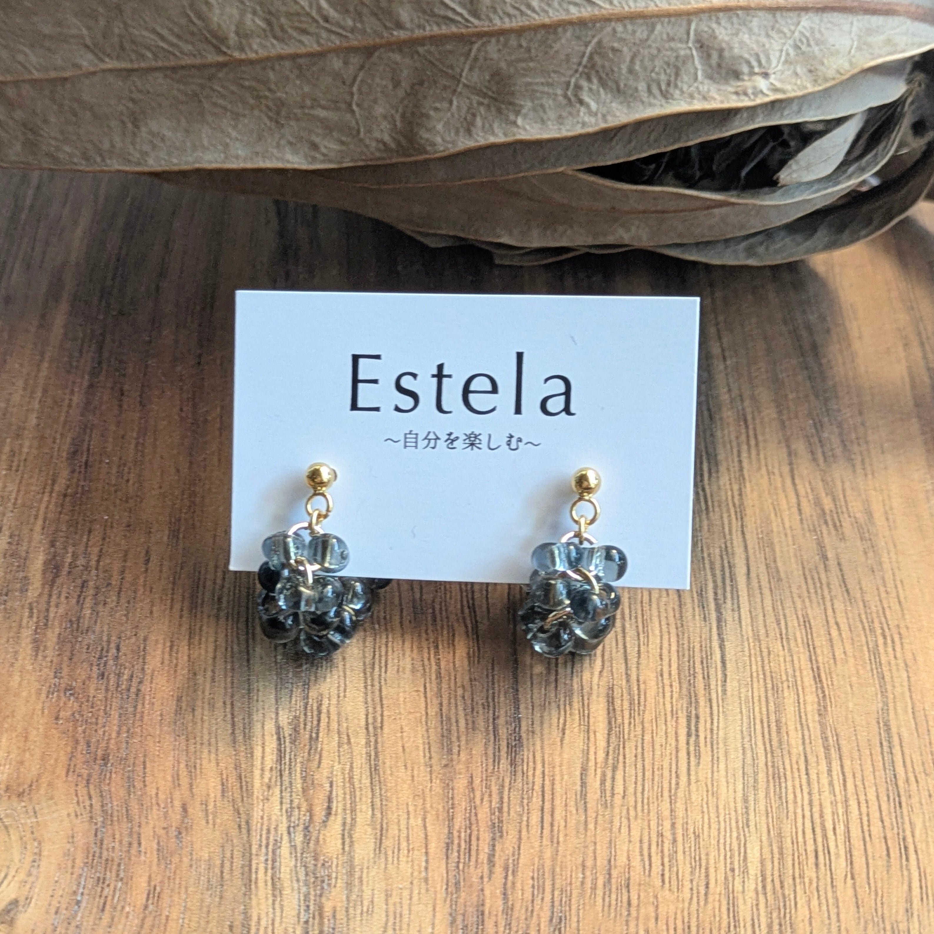 チェコビーズのぷっくりとした丸みのあるファルファーレで立体的な房状のモチーフを作り上げたシリーズです。まるで夜空に瞬く星の集まりや、木々に実る小さな宝石の房のように、繊細で奥深い輝きを耳元に添えます。