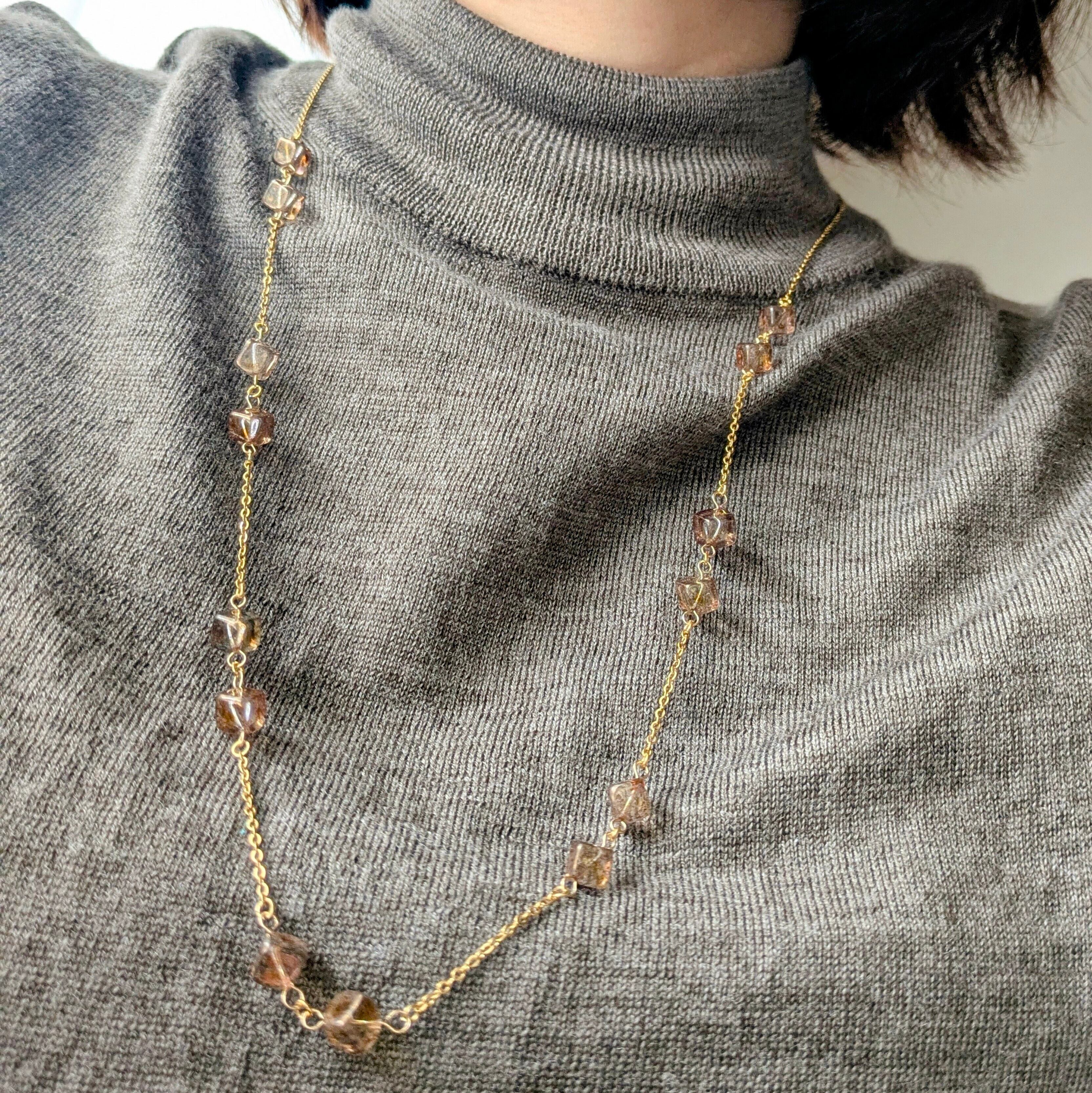 《静寂を溶かす、スモーキーキューブ》 ― とろけるような透光の断片を繋いだ、光のロングネックレス ―