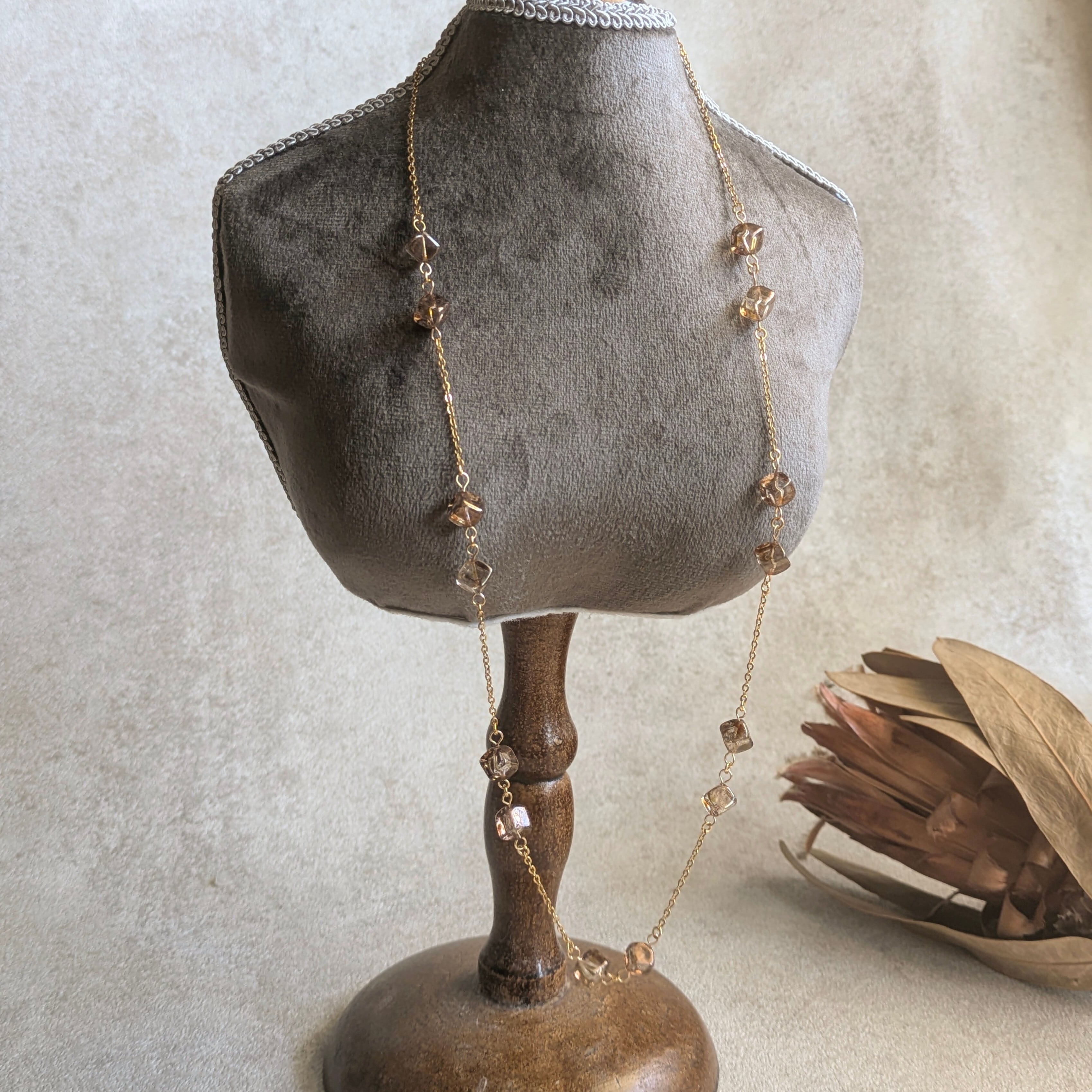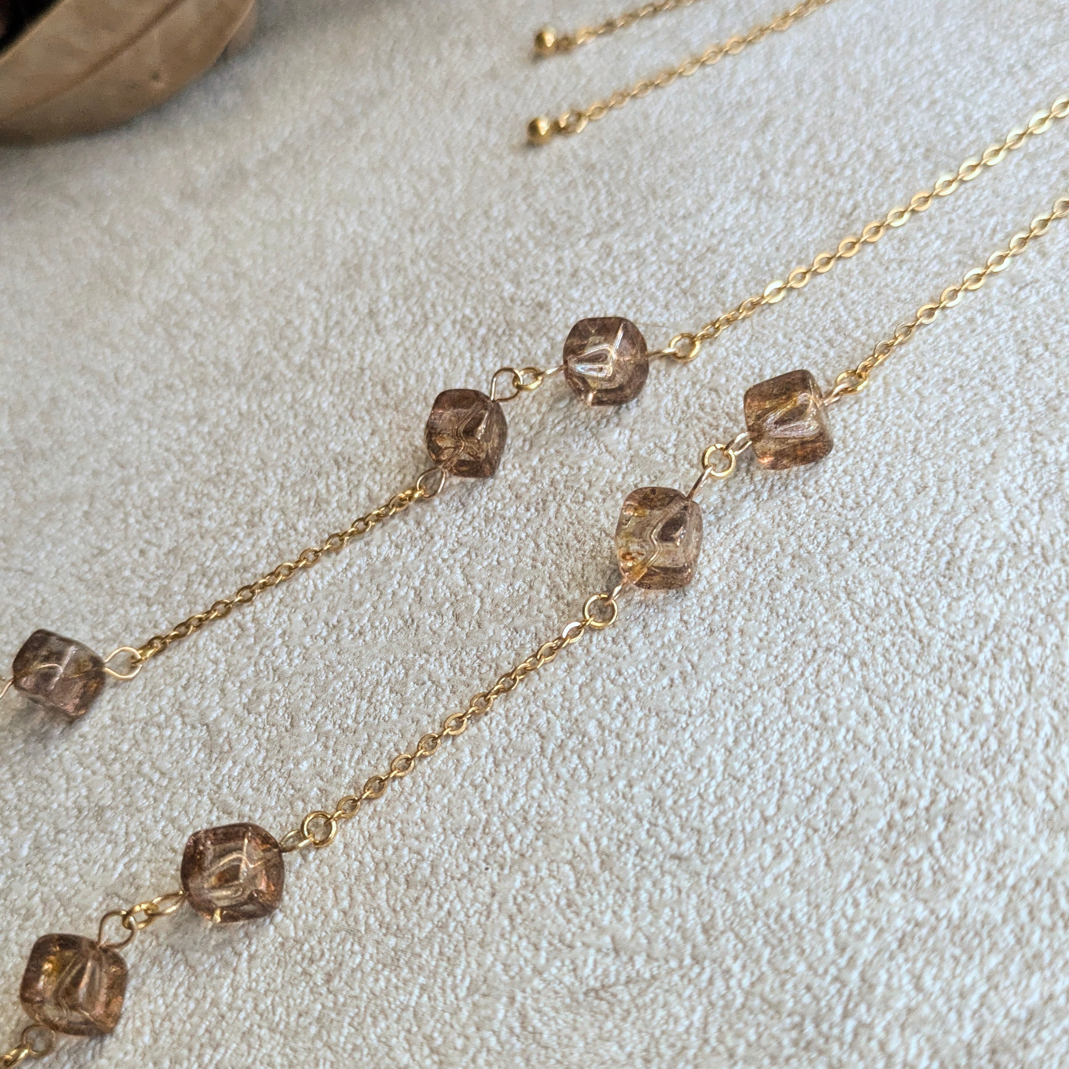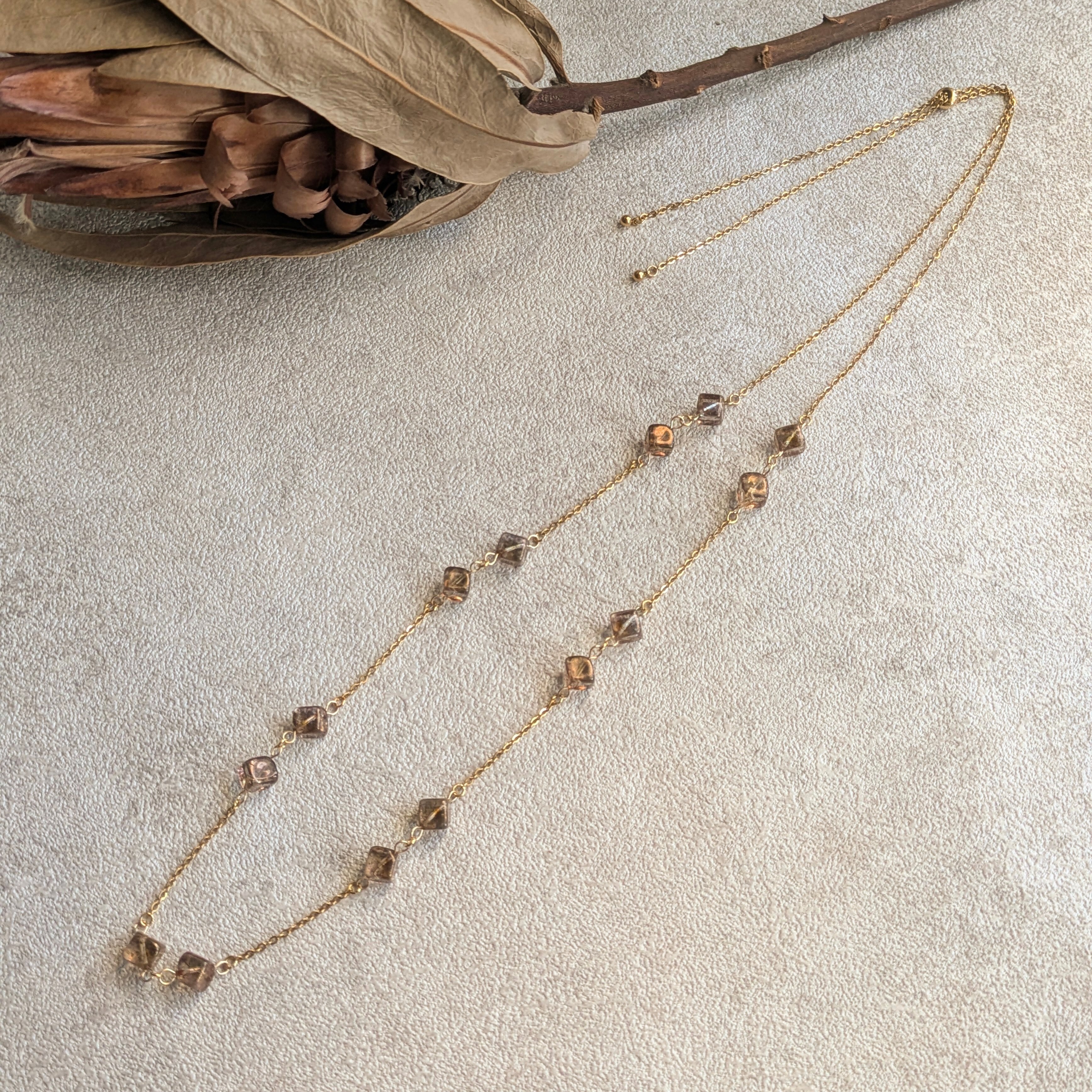 時を止めた雫がとろけるように形を成したような、透明感あふれるスモーキーブラウンのキューブビーズを贅沢に繋ぎました。一粒一粒が異なる光を孕み、胸元に柔らかな影を落とす、繊細で詩的な佇まいが魅力です。