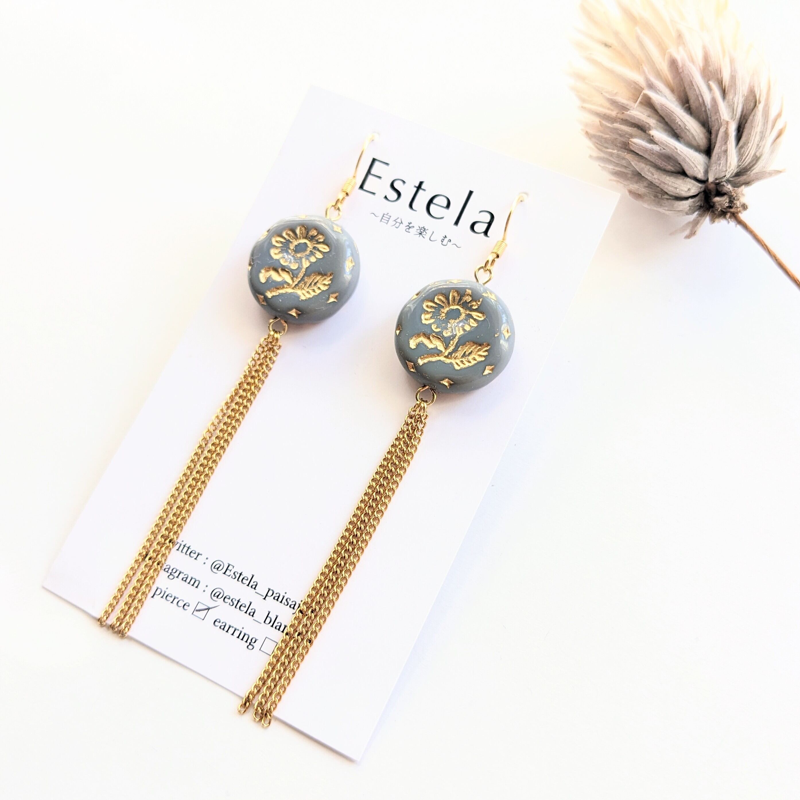 【Sale】グレーのコインフラワーのチェコビーズとロングチェーンピアス