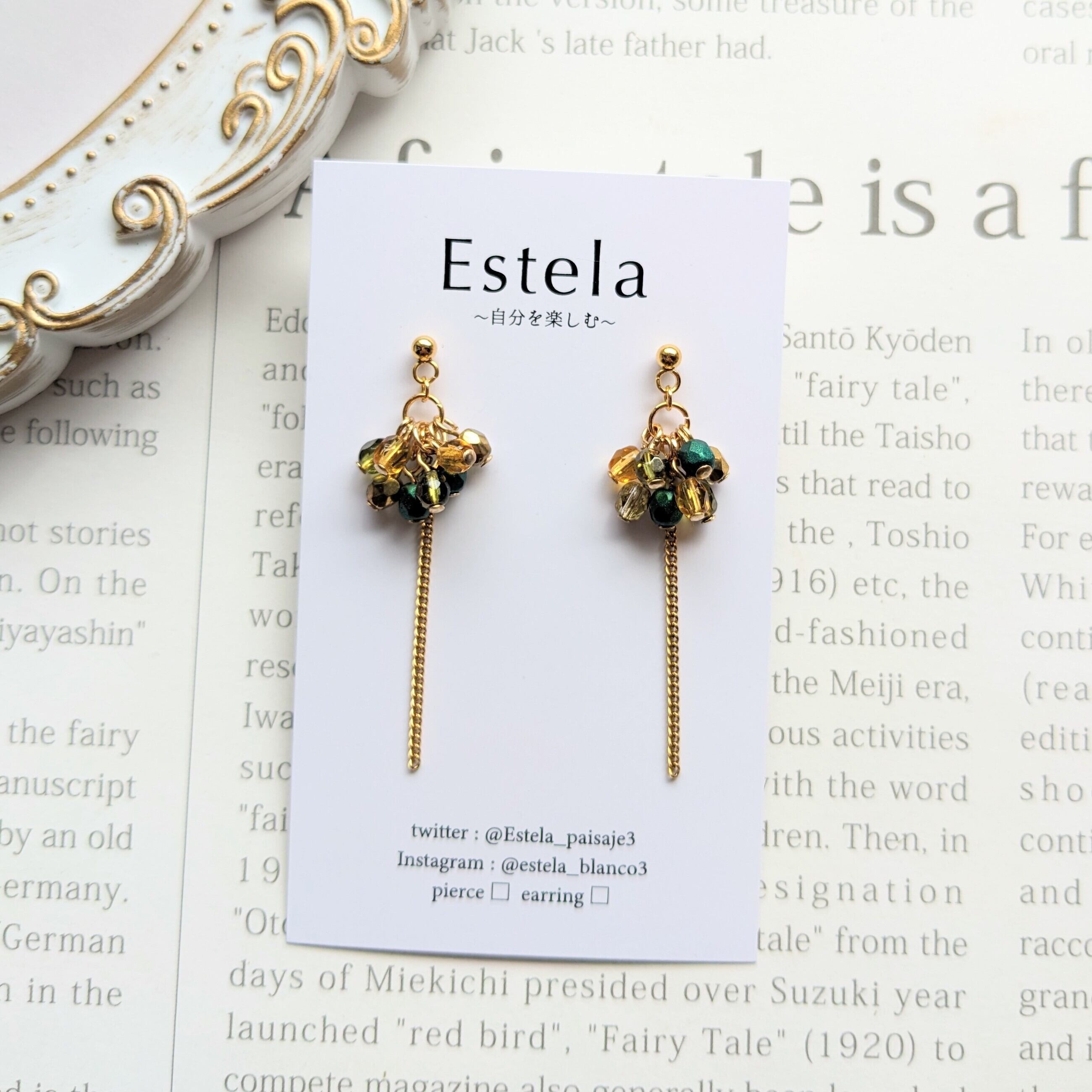 グリーンと柔らかいイエローのチェコビーズのつぶつぶを実りの秋の色合いでバランスよく組合せて、そこに一本のエレガントなロングチェーンをプラスして女性らしく可愛く仕上げました。
