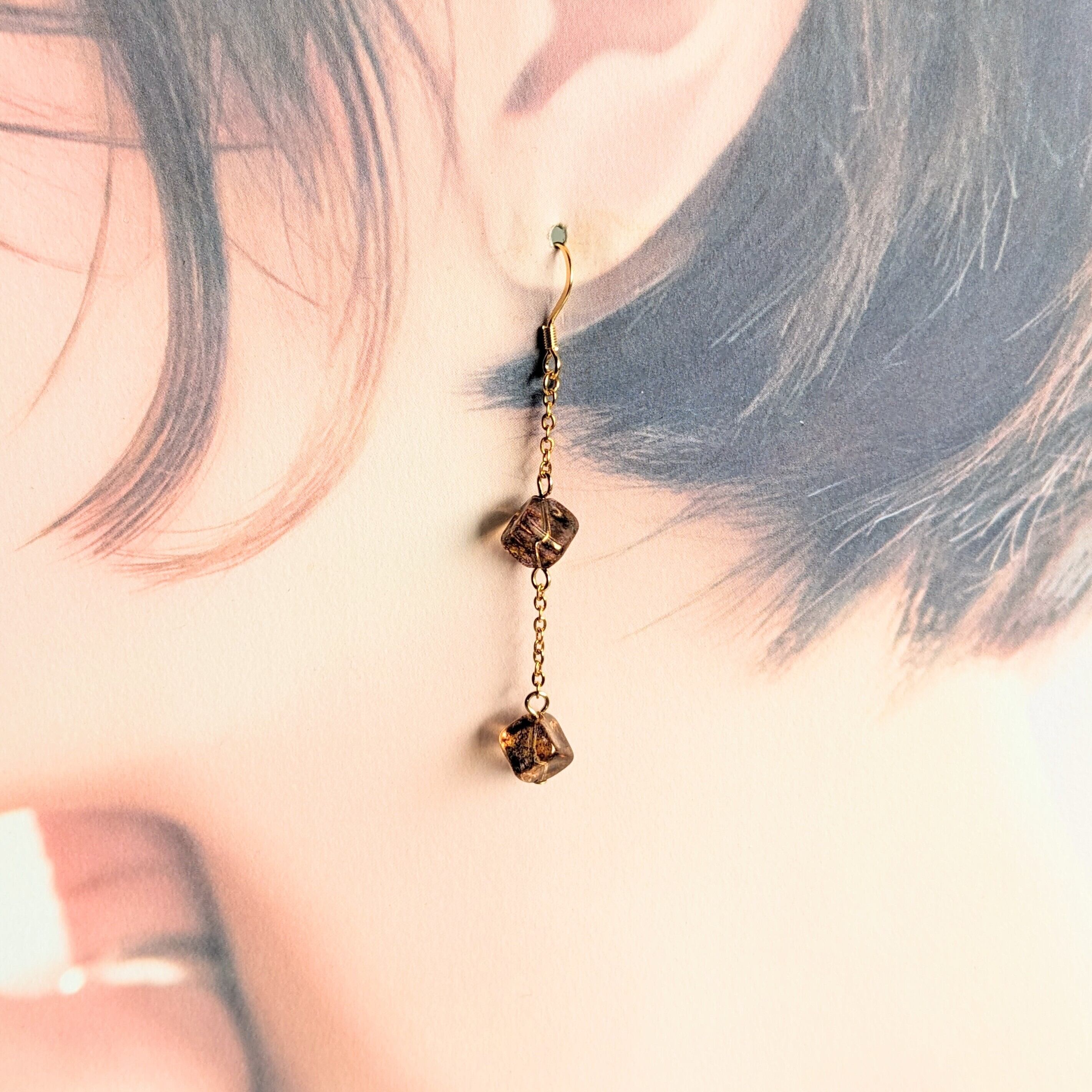 飴のようなラスタートパーズのとろけるキューブをチェーンで繋ぎました。デザインがシンプルなので合わせやすくデイリーに使えるシックで揺れるピアスです。