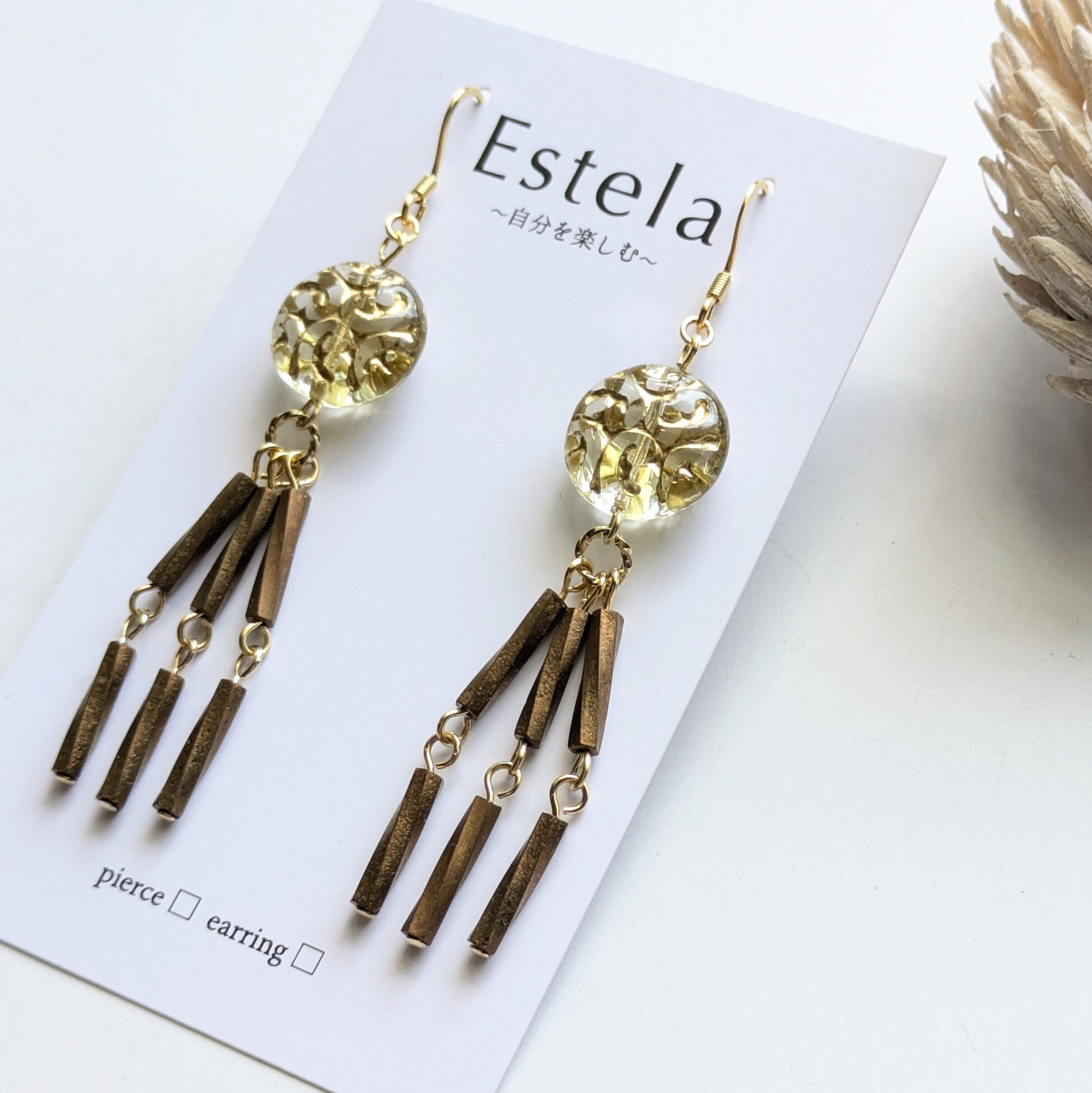 艶っぽいクリスタルゴールドのアラベスクコインとブロンズのツイストビーズフリンジがエキゾチックで個性的なアクセサリーです。華やかなアラベスクコインと煌めくクリスタルゴールドがあなたの耳元をより一層美しく上品に彩ります。揺れるフリンジが女性らしく存在感のある装いを演出してくれます。