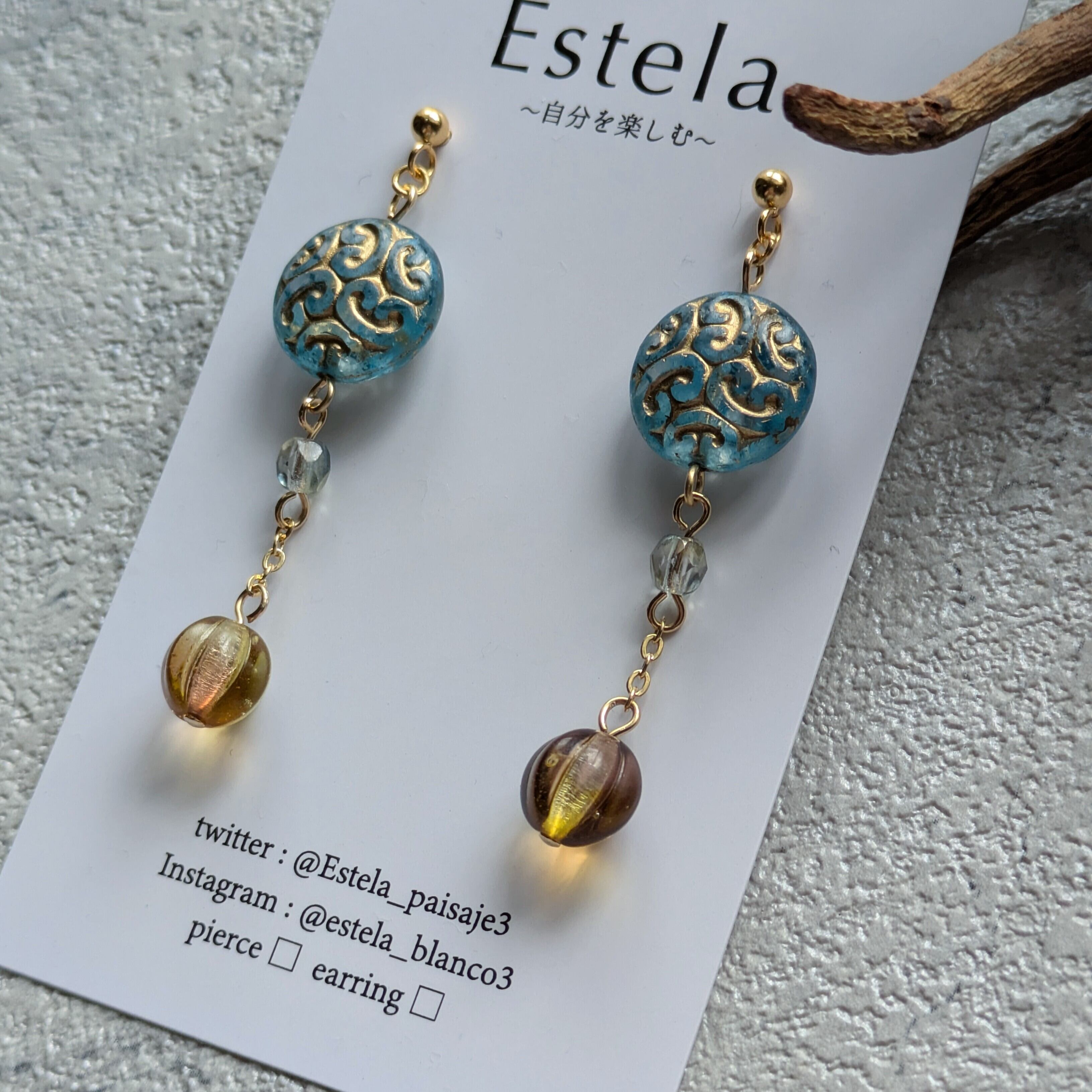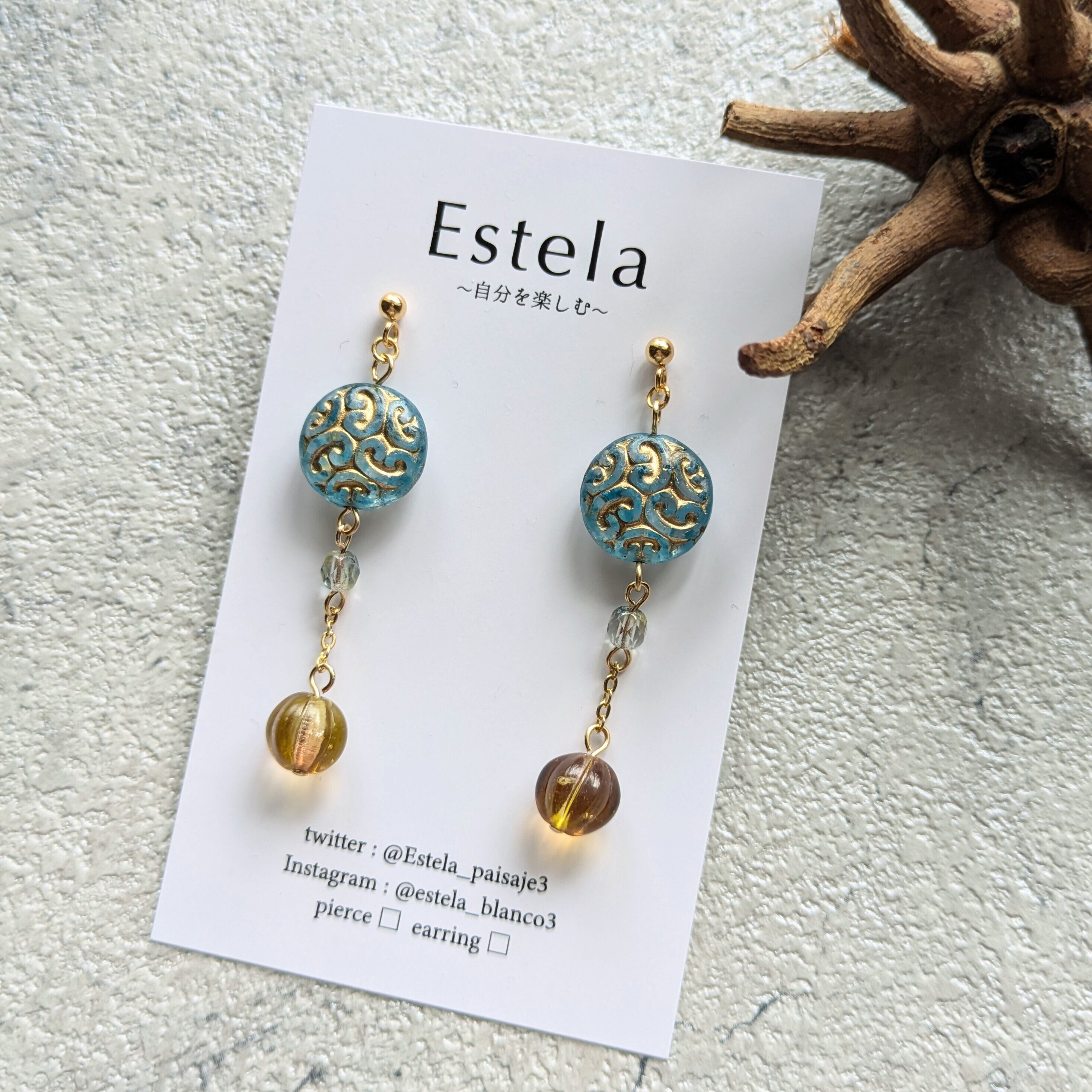 ブルークリスタルのアラベスクコインとマスタードパンプキン ピアス/イヤリング