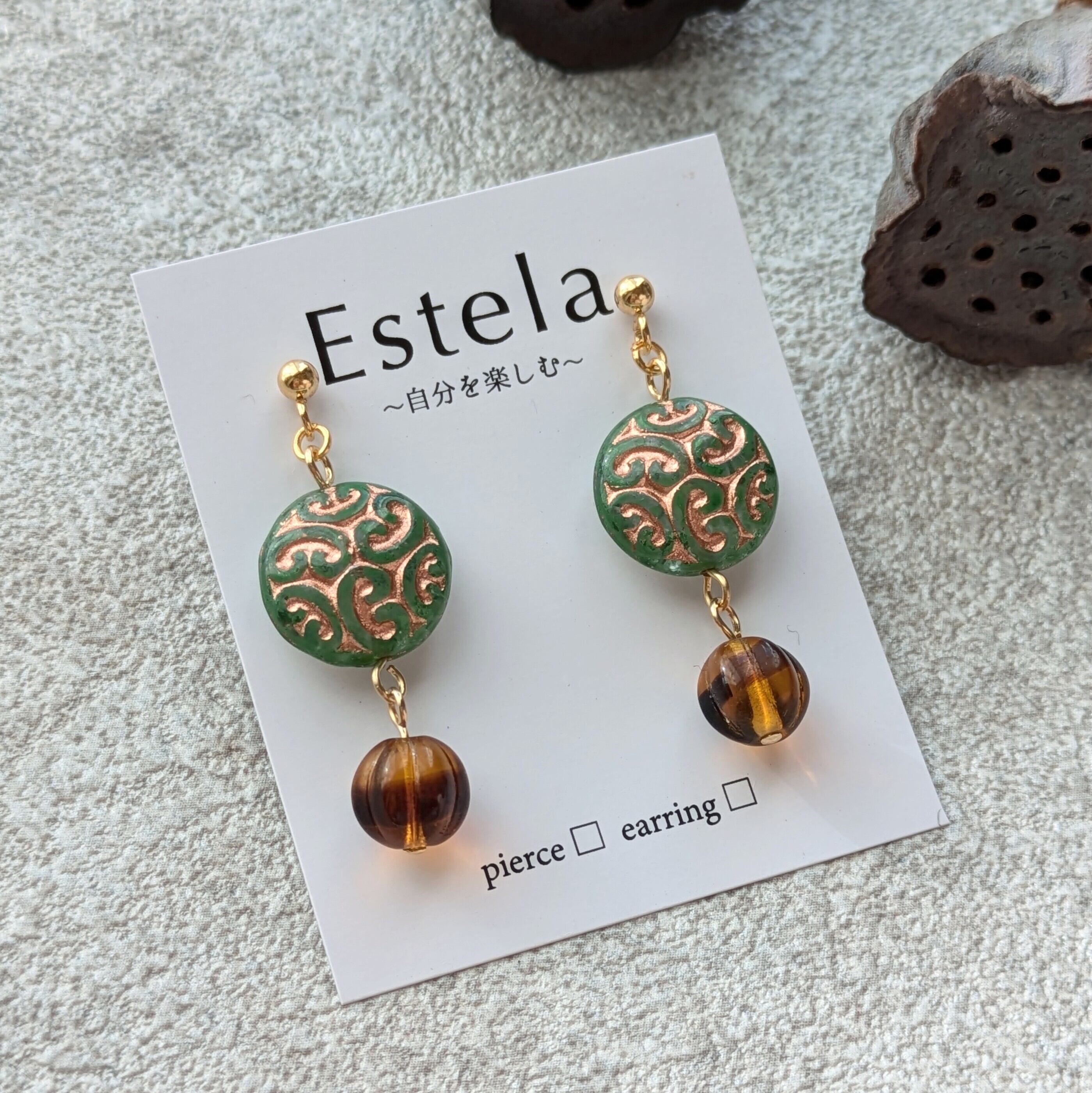 クリアグリーンのアラベスクコインとべっ甲風パンプキン ピアス/イヤリング