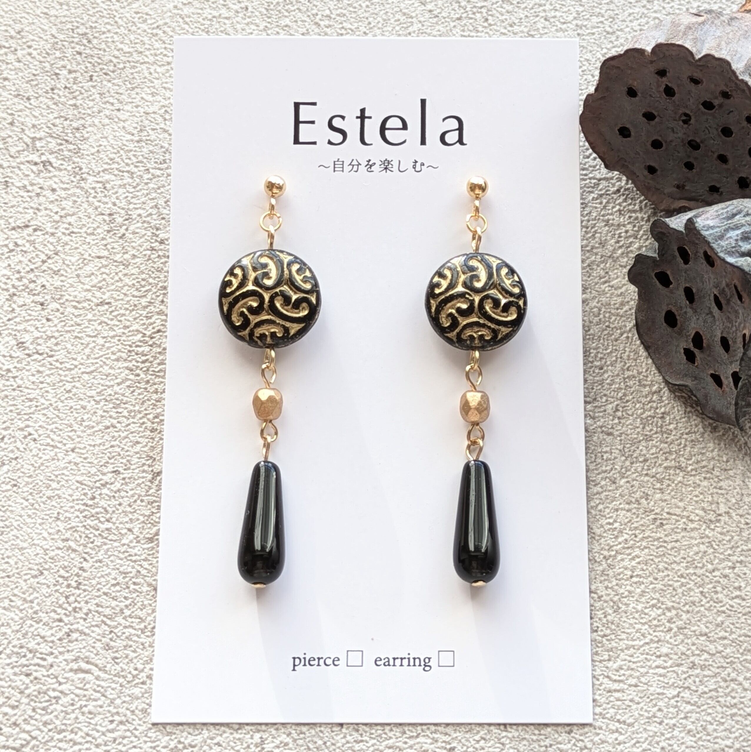 《夜の闇に浮かぶ》ブラックアラベスク チェコガラス ピアス/イヤリング